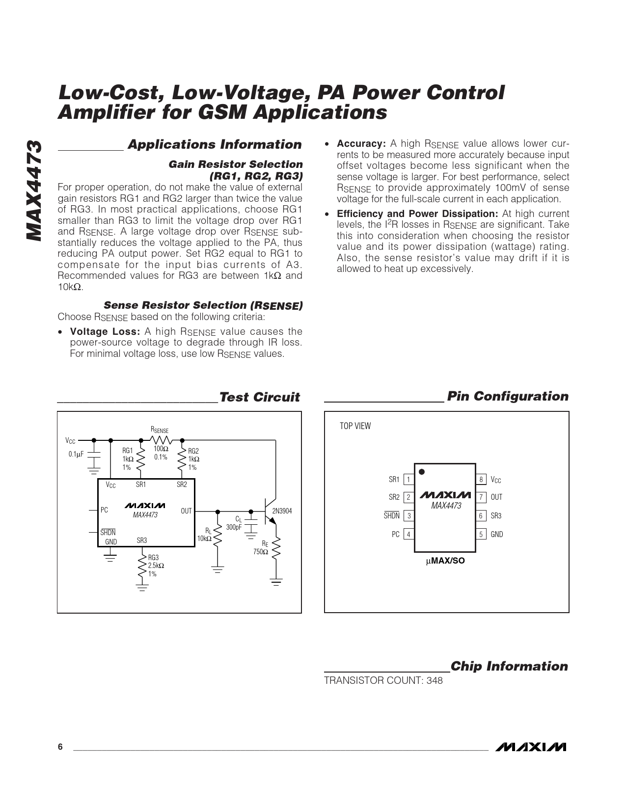 Low-Cost, Low-Voltage, PA Power Control Amplifier for GSM ApplicationsApplications Information • Accuracy: A high RSENSE value allows lower cur- rents to be measured more accurately because input Gain Resistor Selection offset voltages become less significant when the (RG1, RG2, RG3) sense voltage is larger. For best performance, select For proper operation, do not make the value of external RSENSE to provide approximately 100mV of sense gain resistors RG1 and RG2 larger than twice the value voltage for the full-scale current in each application. of RG3. In most practical applications, choose RG1 • Efficiency and Power Dissipation: At high current smaller than RG3 to limit the voltage drop over RG1 levels, the I2R losses in RSENSE are significant. Take MAX4473 and RSENSE. A large voltage drop over RSENSE sub- this into consideration when choosing the resistor stantially reduces the voltage applied to the PA, thus value and its power dissipation (wattage) rating. reducing PA output power. Set RG2 equal to RG1 to Also, the sense resistor’s value may drift if it is compensate for the input bias currents of A3. allowed to heat up excessively. Recommended values for RG3 are between 1kΩ and 10kΩ. Sense Resistor Selection (RSENSE) Choose RSENSE based on the following criteria: • Voltage Loss: A high RSENSE value causes the power-source voltage to degrade through IR loss. For minimal voltage loss, use low RSENSE values. _________________________Test CircuitPin Configuration TOP VIEW RSENSE VCC RG1 100Ω RG2 0.1μF 1kΩ 0.1% 1kΩ 1% 1% SR1 1 8 VCC VCC SR1 SR2 SR2 2 7 OUT MAX4473 PC OUT 2N3904 MAX4473 C SHDN 3 6 SR3 L 300pF SHDN RL PC 4 5 GND 10kΩ GND SR3 RE 750Ω RG3 μ MAX/SO 2.5kΩ 1% Chip Information TRANSISTOR COUNT: 348 6_______________________________________________________________________________________