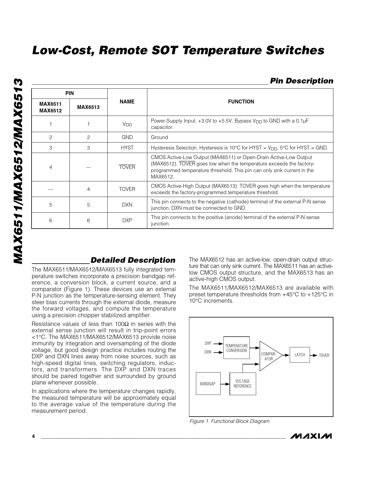 Low-Cost, Remote SOT Temperature SwitchesPin DescriptionPINMAX6511NAMEFUNCTIONMAX6513MAX6512 Power-Supply Input, +3.0V to +5.5V. Bypass V 1 1 V DD to GND with a 0.1µF DD capacitor. 2 2 GND Ground 3 3 HYST Hysteresis Selection. Hysteresis is 10°C for HYST = VDD, 5°C for HYST = GND. CMOS Active-Low Output (MAX6511) or Open-Drain Active-Low Output (MAX6512). TOVER goes low when the temperature exceeds the factory- 4 — TOVER programmed temperature threshold. This pin can only sink current in the MAX6512. CMOS Active-High Output (MAX6513). TOVER goes high when the temperature — 4 TOVER exceeds the factory-programmed temperature threshold. This pin connects to the negative (cathode) terminal of the external P-N sense 5 5 DXN junction. DXN must be connected to GND. This pin connects to the positive (anode) terminal of the external P-N sense 6 6 DXP junction. Detailed Description The MAX6512 has an active-low, open-drain output struc- MAX6511/MAX6512/MAX6513 ture that can only sink current. The MAX6511 has an active- The MAX6511/MAX6512/MAX6513 fully integrated tem- low CMOS output structure, and the MAX6513 has an perature switches incorporate a precision bandgap ref- active-high CMOS output. erence, a conversion block, a current source, and a comparator (Figure 1). These devices use an external The MAX6511/MAX6512/MAX6513 are available with P-N junction as the temperature-sensing element. They preset temperature thresholds from +45°C to +125°C in steer bias currents through the external diode, measure 10°C increments. the forward voltages, and compute the temperature using a precision chopper stabilized amplifier. Resistance values of less than 100Ω in series with the external sense junction will result in trip-point errors <1°C. The MAX6511/MAX6512/MAX6513 provide noise immunity by integration and oversampling of the diode DXP TEMPERATURE voltage, but good design practice includes routing the DXN CONVERSION DXP and DXN lines away from noise sources, such as COMPAR- LATCH TOVER ATOR high-speed digital lines, switching regulators, induc- tors, and transformers. The DXP and DXN traces should be paired together and surrounded by ground plane whenever possible. VOLTAGE BANDGAP REFERENCE In applications where the temperature changes rapidly, the measured temperature will be approximately equal to the average value of the temperature during the measurement period. Figure 1. Functional Block Diagram 4_______________________________________________________________________________________