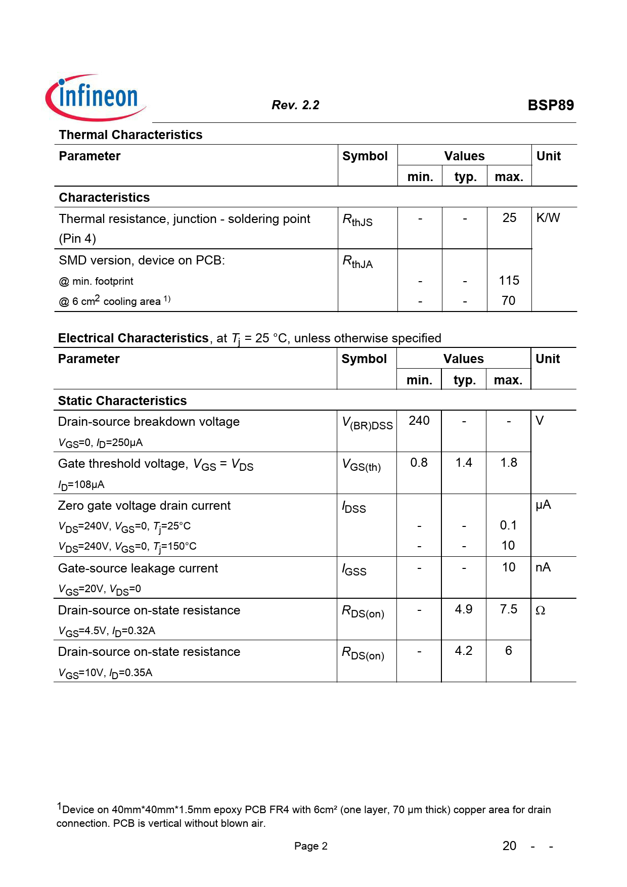 | Seiten / Seite | 8 / 2 — Rev. 2.2. BSP89. Thermal Characteristics Parameter. Symbol. Values. Unit. … |