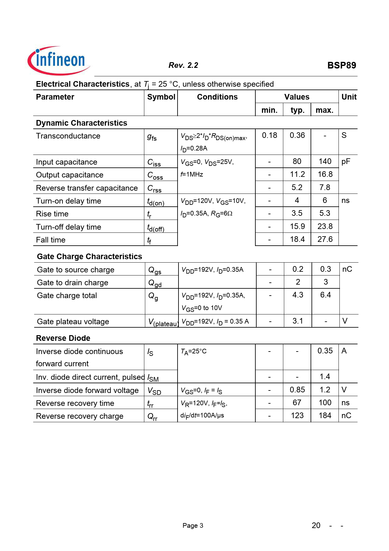 Rev. 2.2. BSP89. Electrical Characteristics. Parameter. Symbol. Conditions. Values. Unit. min. typ. max. Dynamic Characteristics