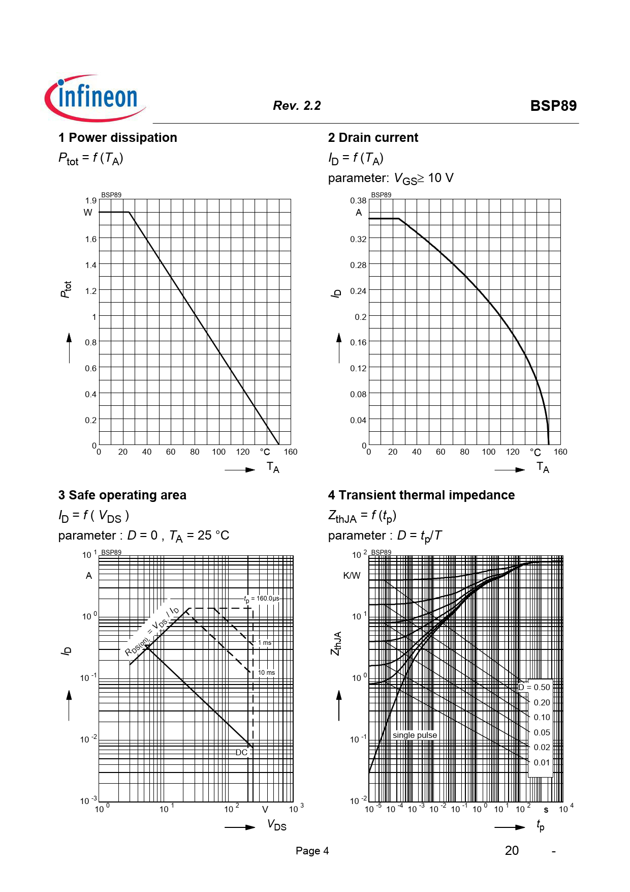 Rev. 2.2BSP891 Power dissipation2 Drain current Ptot = f (TA) ID = f (TA) parameter: VGS³ 10 V BSP89 BSP89 1.9 0.38 W A 1.6 0.32 1.4 0.28 tot 1.2 P 0.24 I D 1 0.2 0.8 0.16 0.6 0.12 0.4 0.08 0.2 0.04 0 0 0 20 40 60 80 100 120 °C 160 0 20 40 60 80 100 120 °C 160 TA TA 3 Safe operating area4 Transient thermal impedance ID = f ( VDS ) ZthJA = f (tp) parameter : D = 0 , TA = 25 °C parameter : D = tp/T 1 10 BSP89 2 10 BSP89 A K/W tp = 160.0µs 0 10 / I D 1 10 V DS = 1 ms I D R DS(on) Z thJA -1 10 ms 10 0 10 D = 0.50 0.20 0.10 0.05 -2 10 -1 10 single pulse 0.02 DC 0.01 -3 10 -2 10 10 0 10 1 10 2 10 3 V 10 -5 10 -4 10 -3 10 -2 10 -1 10 0 10 1 10 2 10 4 s VDS tp Page 4 201211-29