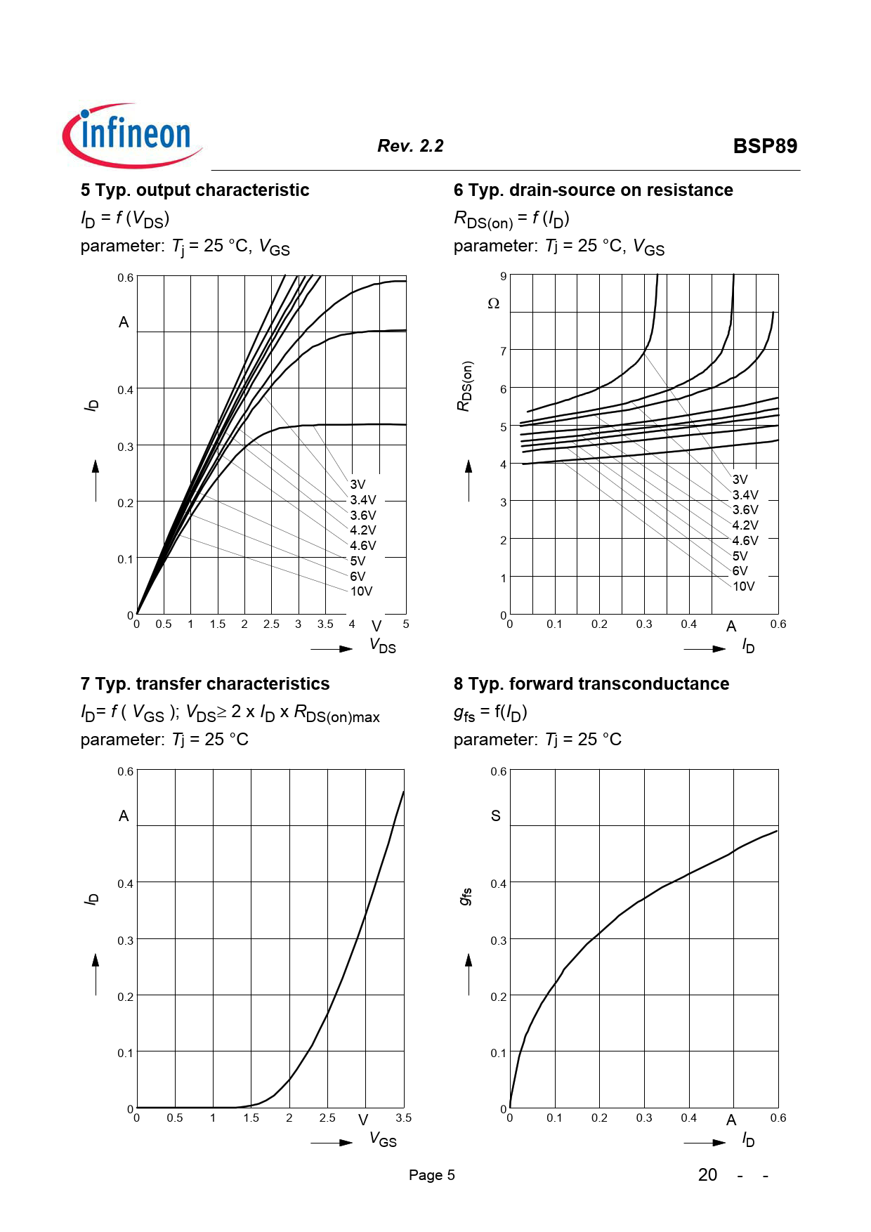 Rev. 2.2. BSP89. 5 Typ. output characteristic. 6 Typ. drain-source on resistance. 7 Typ. transfer characteristics