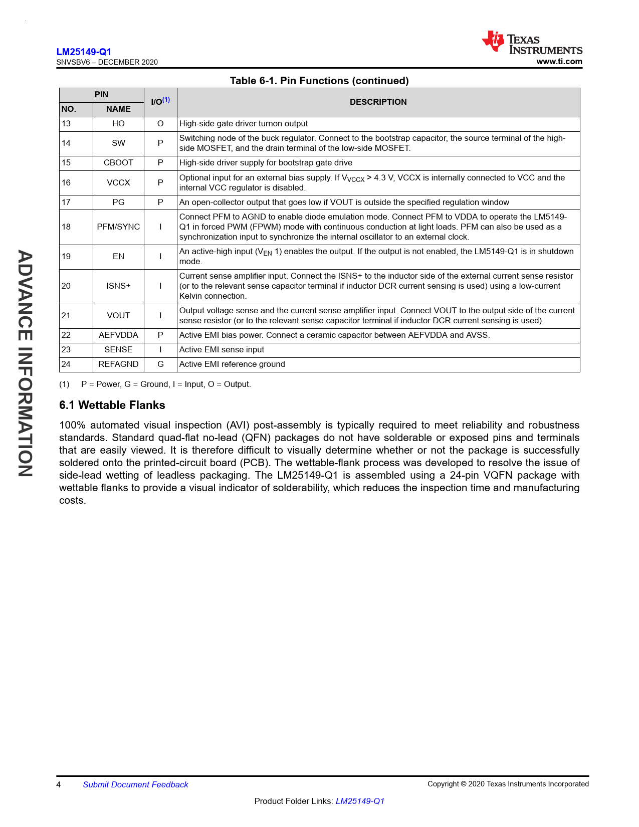 LM25149-Q1. www.ti.com. Table 6-1. Pin Functions (continued). PIN. I/O(1). DESCRIPTION. NO. NAME. NCE INFO. R MA. 6.1 Wettable Flanks. TION