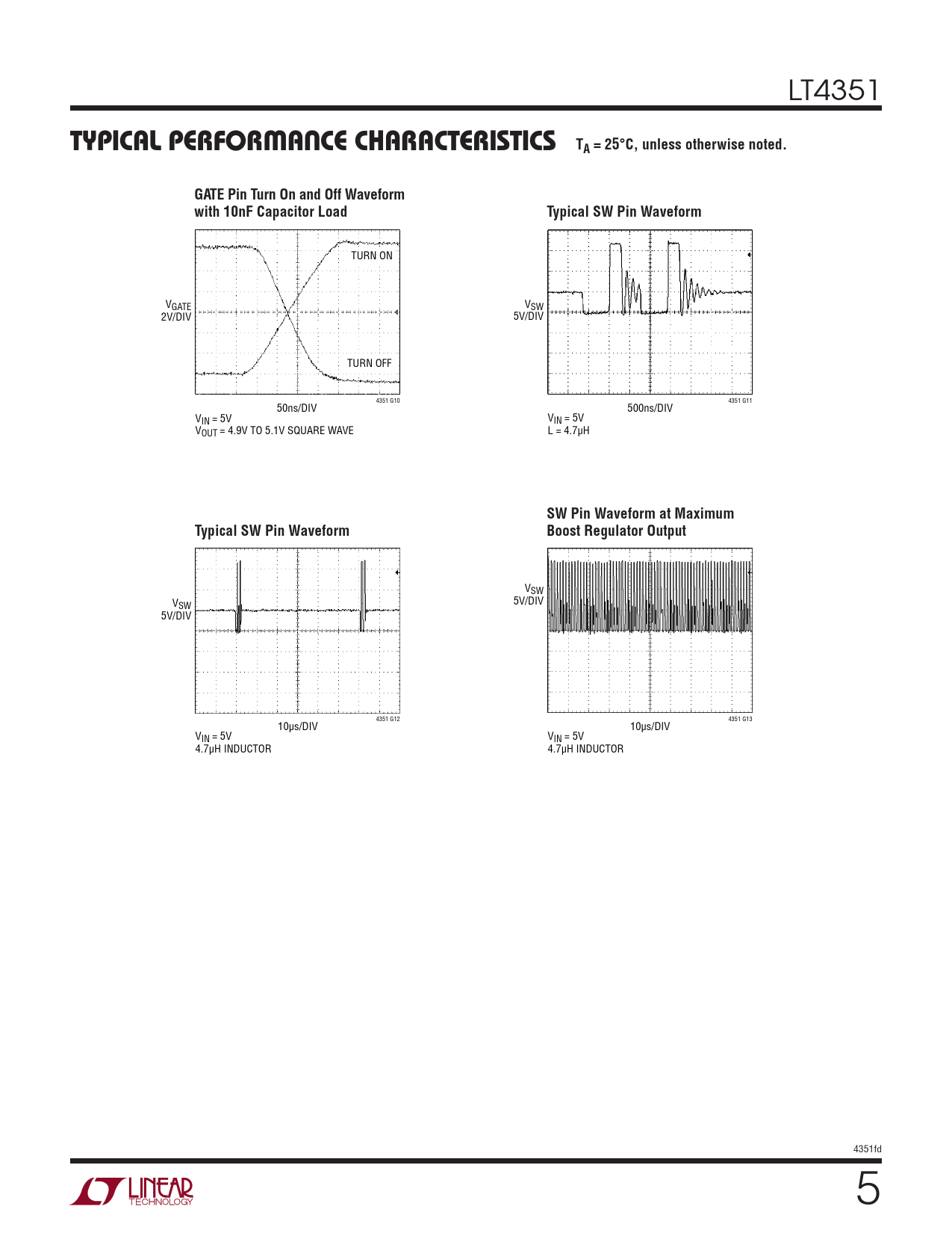 TURN ON VGATE VSW 2V/DIV 5V/DIV TURN OFF 4351 G10 4351 G11 50ns/DIV 500ns/DIV VIN = 5V VIN = 5V VOUT = 4.9V TO 5.1V SQUARE WAVE L = 4.7µH