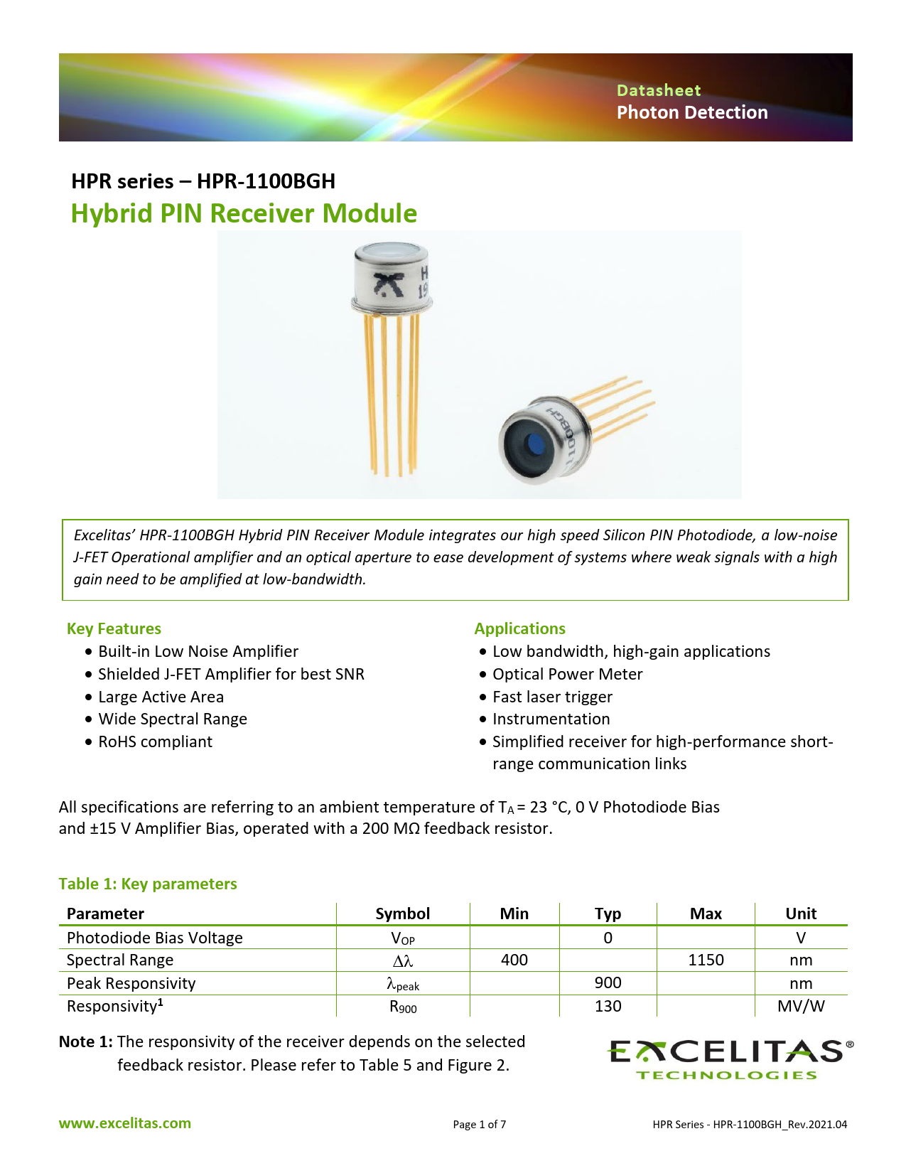 DatasheetDatasheetDatasheetPhoton DetectionPhoton DetectionPhoton DetectionHPR series – HPR-1100BGHHybrid PIN Receiver Module Excelitas’ HPR-1100BGH Hybrid PIN Receiver Module integra tes our high speed Silicon PIN Photodiode, a low-noise J-FET Operational amplifier and an optical aperture to ease development of systems where weak signals with a high gain need to be amplified at low-bandwidth. Key FeaturesApplications • Built-in Low Noise Amplifier • Low bandwidth, high-gain applications • Shielded J-FET Amplifier for best SNR • Optical Power Meter • Large Active Area • Fast laser trigger • Wide Spectral Range • Instrumentation • RoHS compliant • Simplified receiver for high-performance short- range communication links All specifications are referring to an ambient temperature of TA = 23 °C, 0 V Photodiode Bias and ±15 V Amplifier Bias, operated with a 200 MΩ feedback resistor. Table 1: Key parametersParameterSymbolMinTypMaxUnit Photodiode Bias Voltage VOP 0 V Spectral Range 400 1150 nm Peak Responsivity peak 900 nm Responsivity 1 R900 130 MV/W Note 1: The responsivity of the receiver depends on the selected feedback resistor. Please refer to Table 5 and Figure 2. www.excelitas.com Page 1 of 7 HPR Series - HPR-1100BGH_Rev.2021.04