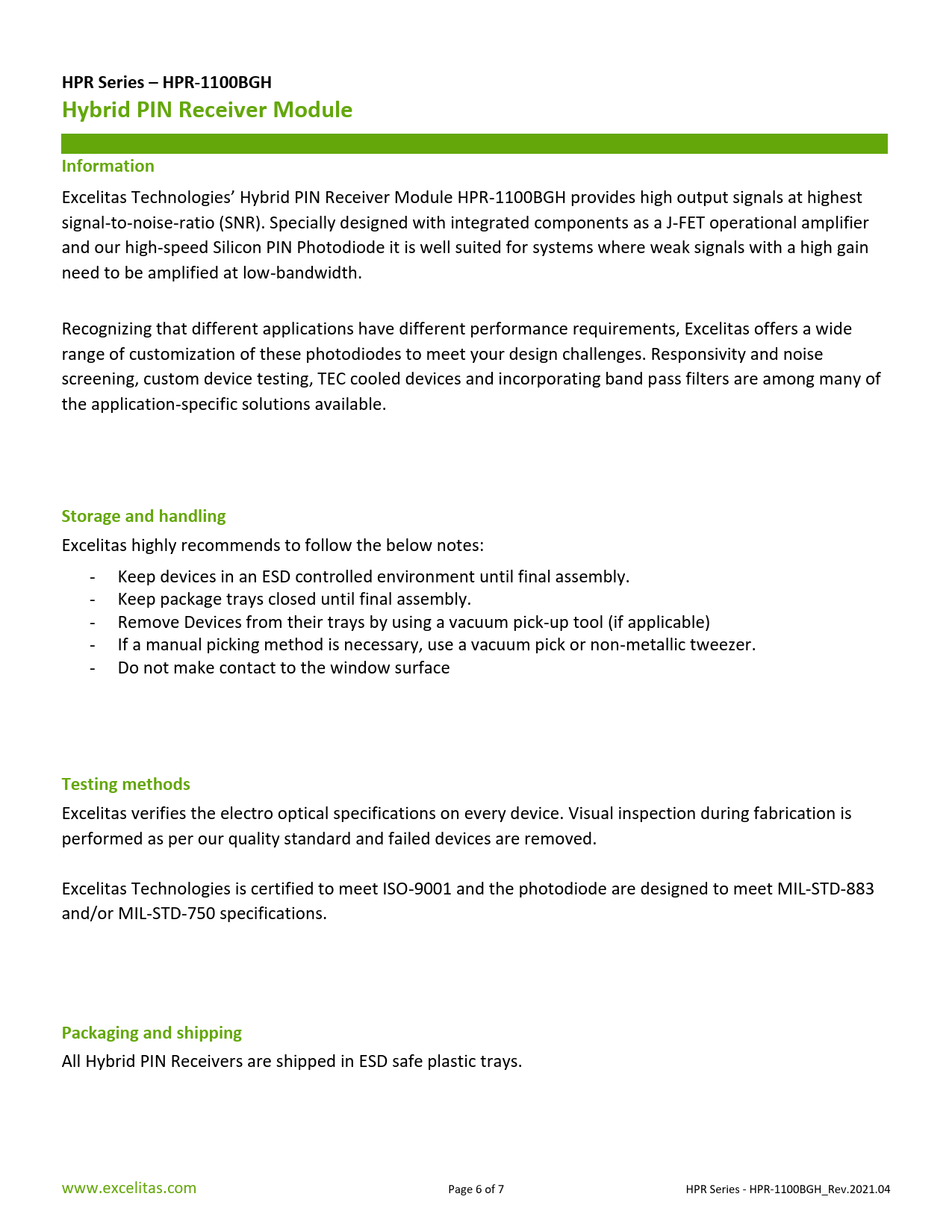 HPR Series – HPR-1100BGH. Hybrid PIN Receiver Module. Information. Storage and handling. Testing methods. Packaging and shipping