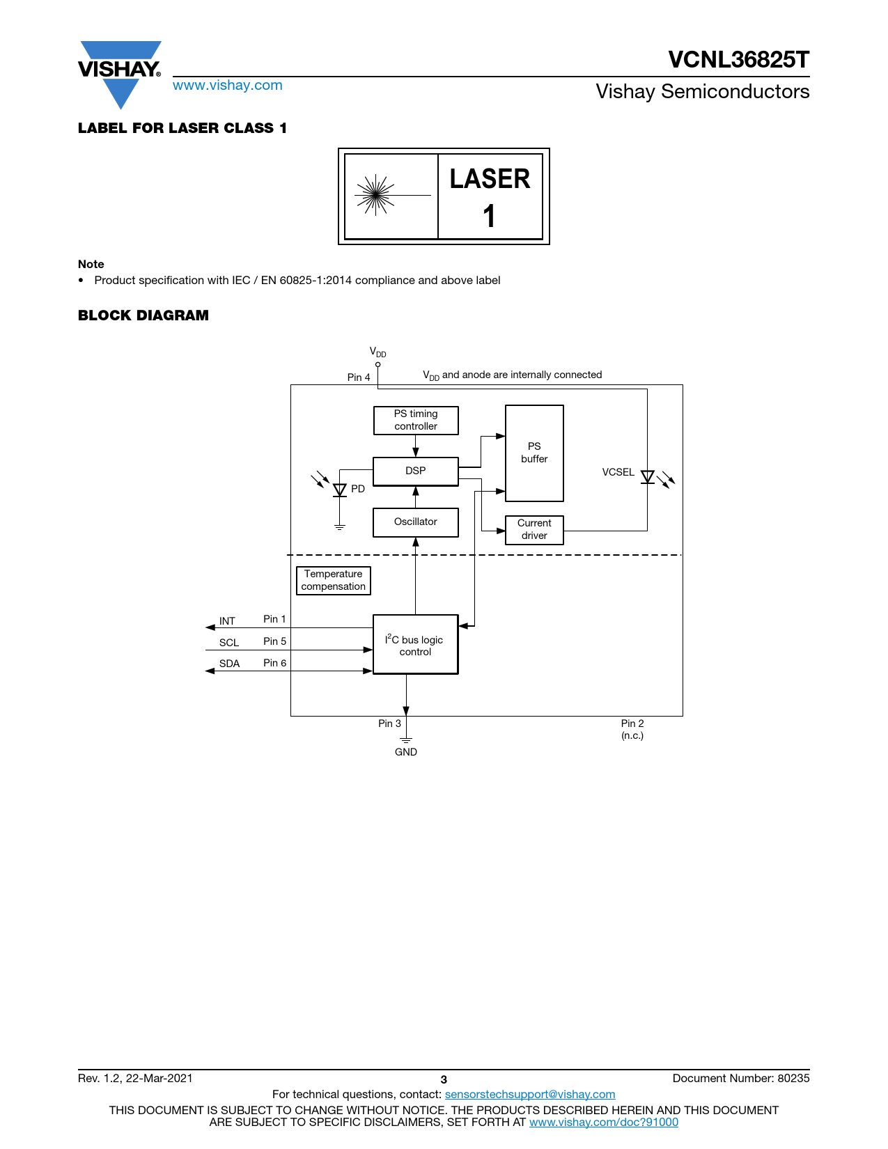 VCNL36825T LABEL FOR LASER CLASS 1 LASER Note BLOCK DIAGRAM