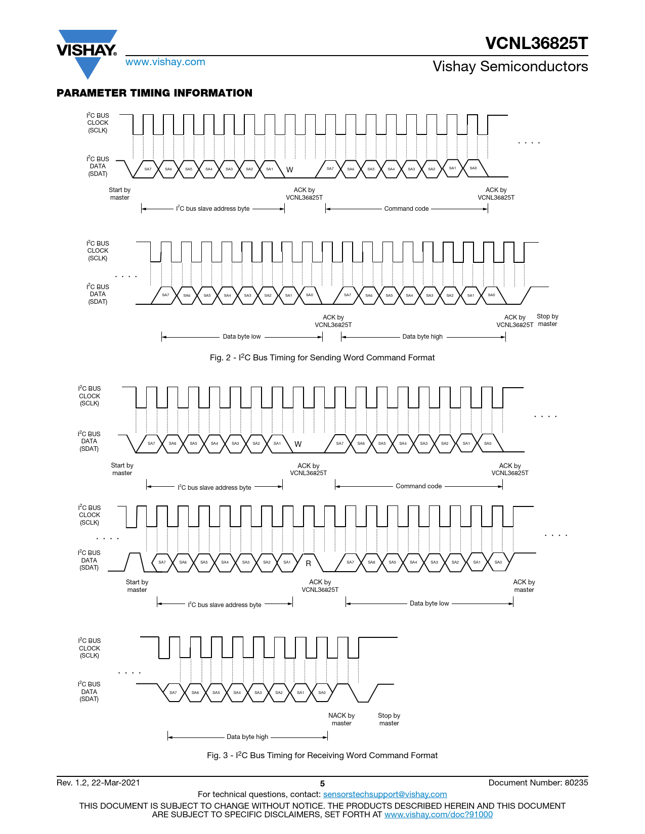 VCNL36825T www.vishay.com Vishay Semiconductors PARAMETER TIMING INFORMATION I2C BUS CLOCK (SCLK) I2C BUS DATA SA7 SA6 SA5 SA4 SA3 SA2 SA1 W SA6 SA5 SA4 SA3 SA2 SA1 SA0 SA7 (SDAT) Start by ACK by ACK by master VCNL36825T VCNL36825T I2C bus slave address byte Command code I2C BUS CLOCK (SCLK) I2C BUS DATA SA7 SA6 SA5 SA4 SA3 SA2 SA1 SA0 SA7 SA6 SA5 SA4 SA3 SA2 SA1 SA0 (SDAT) ACK by ACK by Stop by VCNL36825T VCNL36825T master Data byte low Data byte high Fig. 2 - I2C Bus Timing for Sending Word Command Format I2C BUS CLOCK (SCLK) I2C BUS DATA SA7 SA6 SA5 SA4 SA3 SA2 SA1 W SA7 SA6 SA5 SA4 SA3 SA2 SA1 SA0 (SDAT) Start by ACK by ACK by master VCNL36825T VCNL36825T I2C bus slave address byte Command code I2C BUS CLOCK (SCLK) I2C BUS DATA SA7 SA6 SA5 SA4 SA3 SA2 SA1 R SA7 SA6 SA5 SA4 SA3 SA2 SA1 SA0 (SDAT) Start by ACK by ACK by master VCNL36825T master I2C bus slave address byte Data byte low I2C BUS CLOCK (SCLK) I2C BUS DATA SA7 SA6 SA5 SA4 SA3 SA2 SA1 SA0 (SDAT) NACK by Stop by master master Data byte high Fig. 3 - I2C Bus Timing for Receiving Word Command Format Rev. 1.2, 22-Mar-2021 5 Document Number: 80235 For technical questions, contact: sensorstechsupport@vishay.com THIS DOCUMENT IS SUBJECT TO CHANGE WITHOUT NOTICE. THE PRODUCTS DESCRIBED HEREIN AND THIS DOCUMENT ARE SUBJECT TO SPECIFIC DISCLAIMERS, SET FORTH AT www.vishay.com/doc?91000