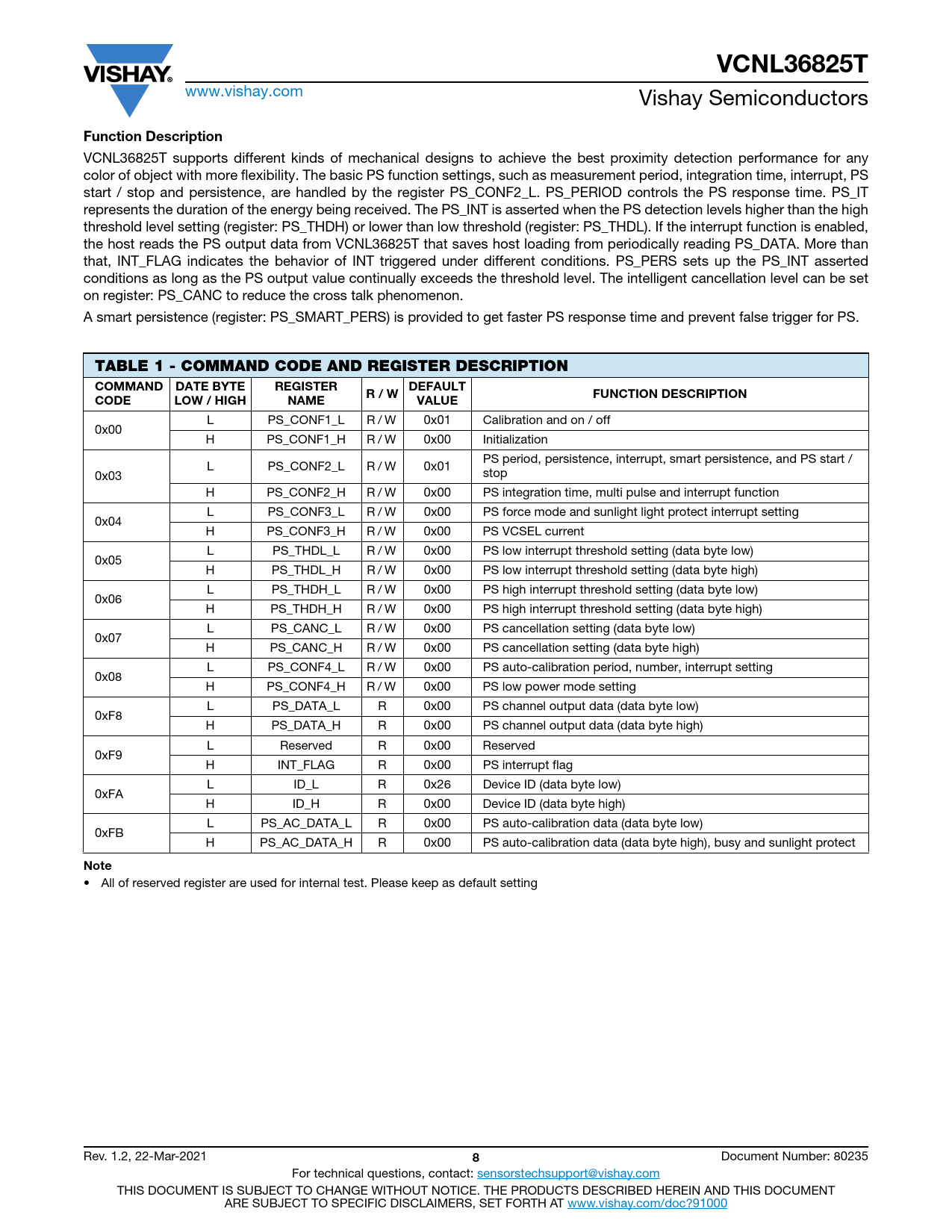 VCNL36825T. Function Description. TABLE 1 - COMMAND CODE AND REGISTER DESCRIPTION COMMAND. DATE BYTE. REGISTER. DEFAULT. R / W