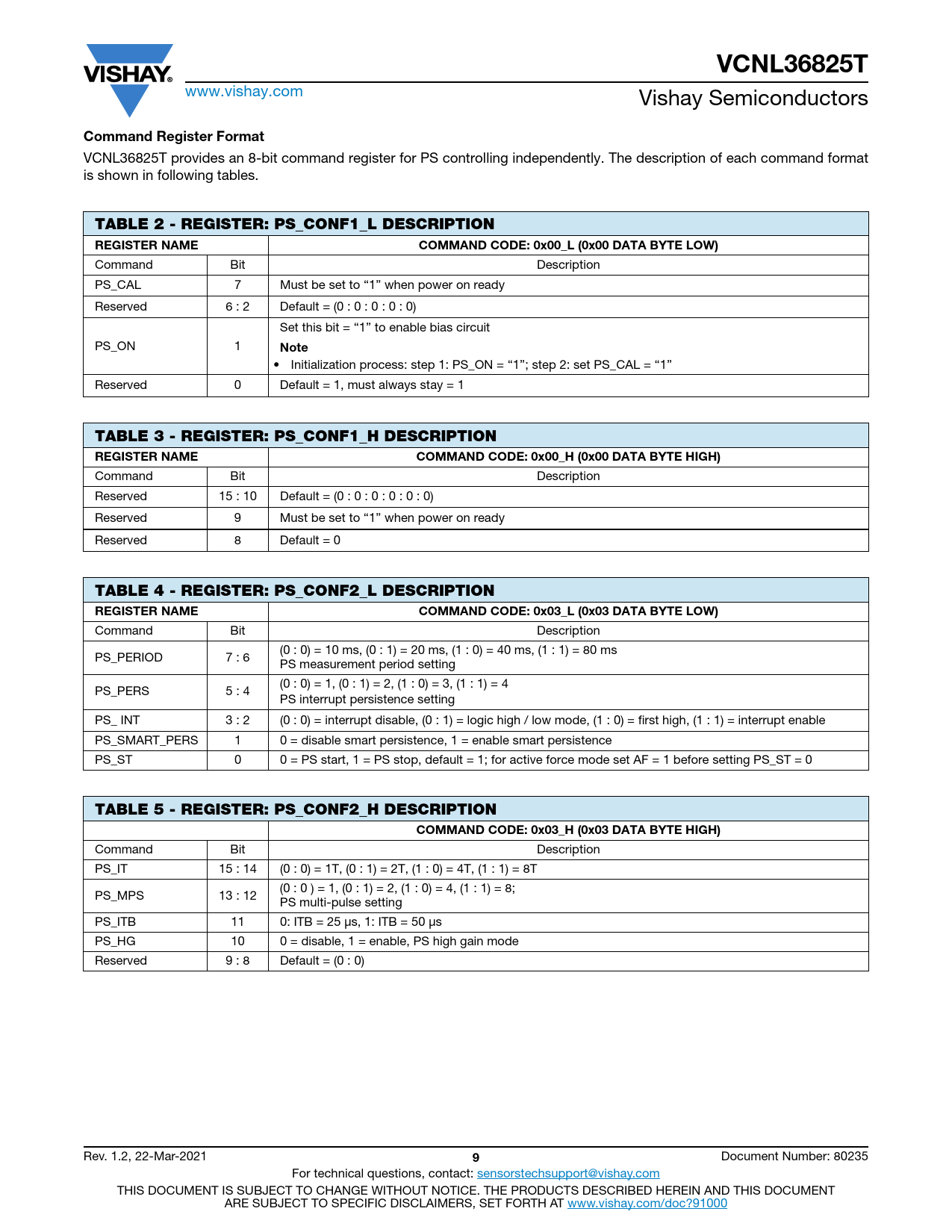 VCNL36825T. Command Register Format. TABLE 2 - REGISTER: PS_CONF1_L DESCRIPTION REGISTER NAME