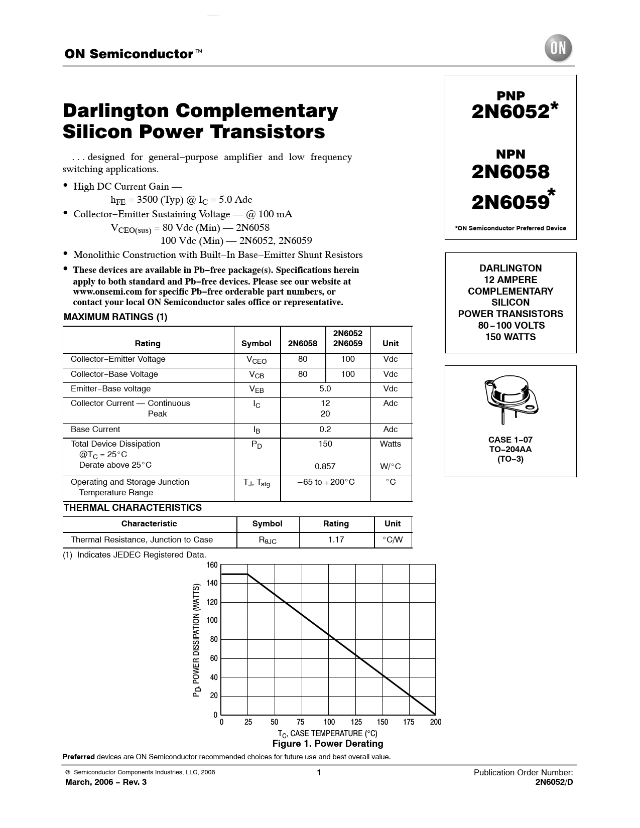 March, 2006 − Rev. 3 2N6052/D
