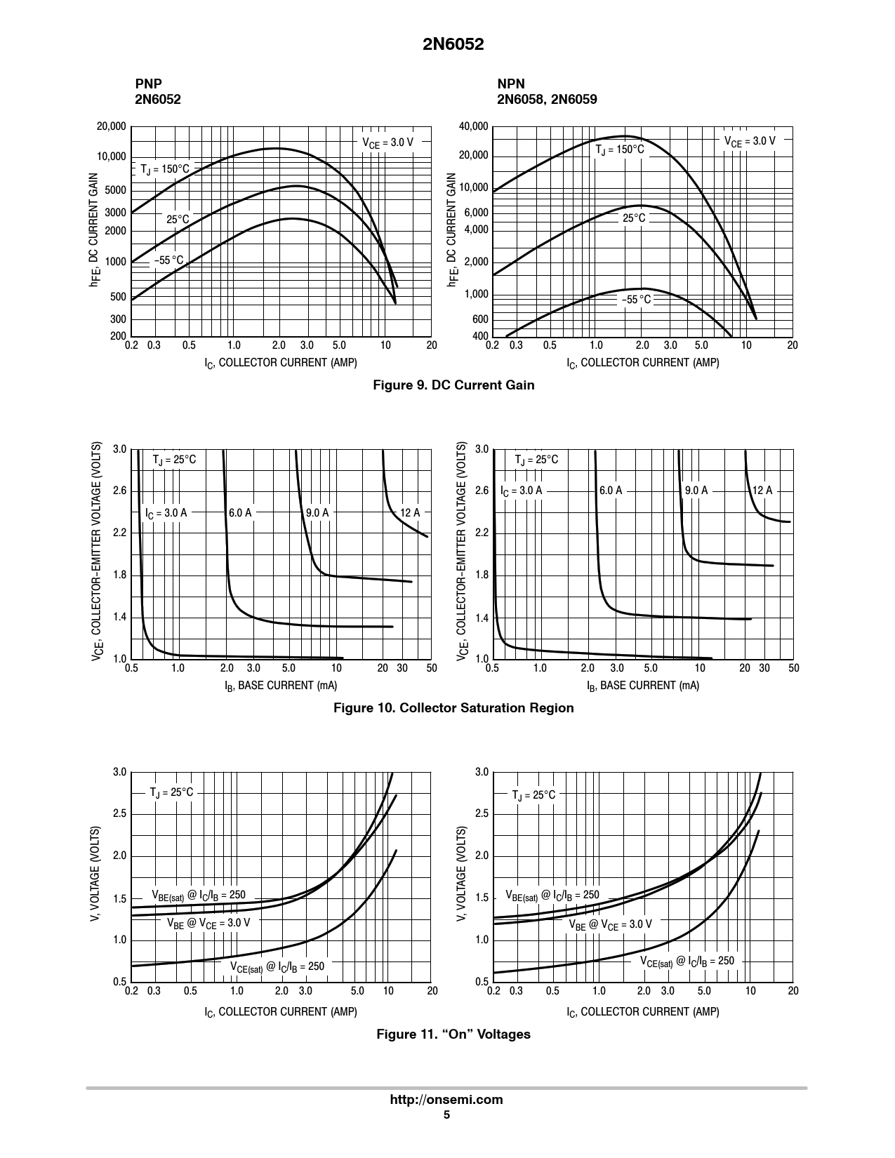 2N6052PNPNPN2N60522N6058, 2N6059 20,000 40,000 V V CE = 3.0 V CE = 3.0 V T 10,000 J = 150°C 20,000 TJ = 150°C 10,000 GAIN 5000 GAIN 3000 6,000 25°C 25°C 2000 4,000 , DC CURRENT 1000 −55 °C , DC CURRENT 2,000 FE FE h h 500 1,000 −55 °C 300 600 200 400 0.2 0.3 0.5 1.0 2.0 3.0 5.0 10 20 0.2 0.3 0.5 1.0 2.0 3.0 5.0 10 20 IC, COLLECTOR CURRENT (AMP) IC, COLLECTOR CURRENT (AMP) Figure 9. DC Current Gain TS) 3.0 TS) 3.0 TJ = 25°C TJ = 25°C (VOL (VOL 2.6 2.6 IC = 3.0 A 6.0 A 9.0 A 12 A TAGE TAGE IC = 3.0 A 6.0 A 9.0 A 12 A VOL VOL 2.2 2.2 1.8 1.8 OR−EMITTER OR−EMITTER 1.4 1.4 , COLLECT , COLLECT CE CE V 1.0 V 1.0 0.5 1.0 2.0 3.0 5.0 10 20 30 50 0.5 1.0 2.0 3.0 5.0 10 20 30 50 IB, BASE CURRENT (mA) IB, BASE CURRENT (mA) Figure 10. Collector Saturation Region 3.0 3.0 TJ = 25°C TJ = 25°C 2.5 2.5 TS) TS) 2.0 (VOL (VOL 2.0 TAGE TAGE 1.5 VBE(sat) @ IC/IB = 250 1.5 VBE(sat) @ IC/IB = 250 , VOL , VOL V V V BE @ VCE = 3.0 V VBE @ VCE = 3.0 V 1.0 1.0 V V CE(sat) @ IC/IB = 250 CE(sat) @ IC/IB = 250 0.5 0.5 0.2 0.3 0.5 1.0 2.0 3.0 5.0 10 20 0.2 0.3 0.5 1.0 2.0 3.0 5.0 10 20 IC, COLLECTOR CURRENT (AMP) IC, COLLECTOR CURRENT (AMP) Figure 11. “On” Voltageshttp://onsemi.com5