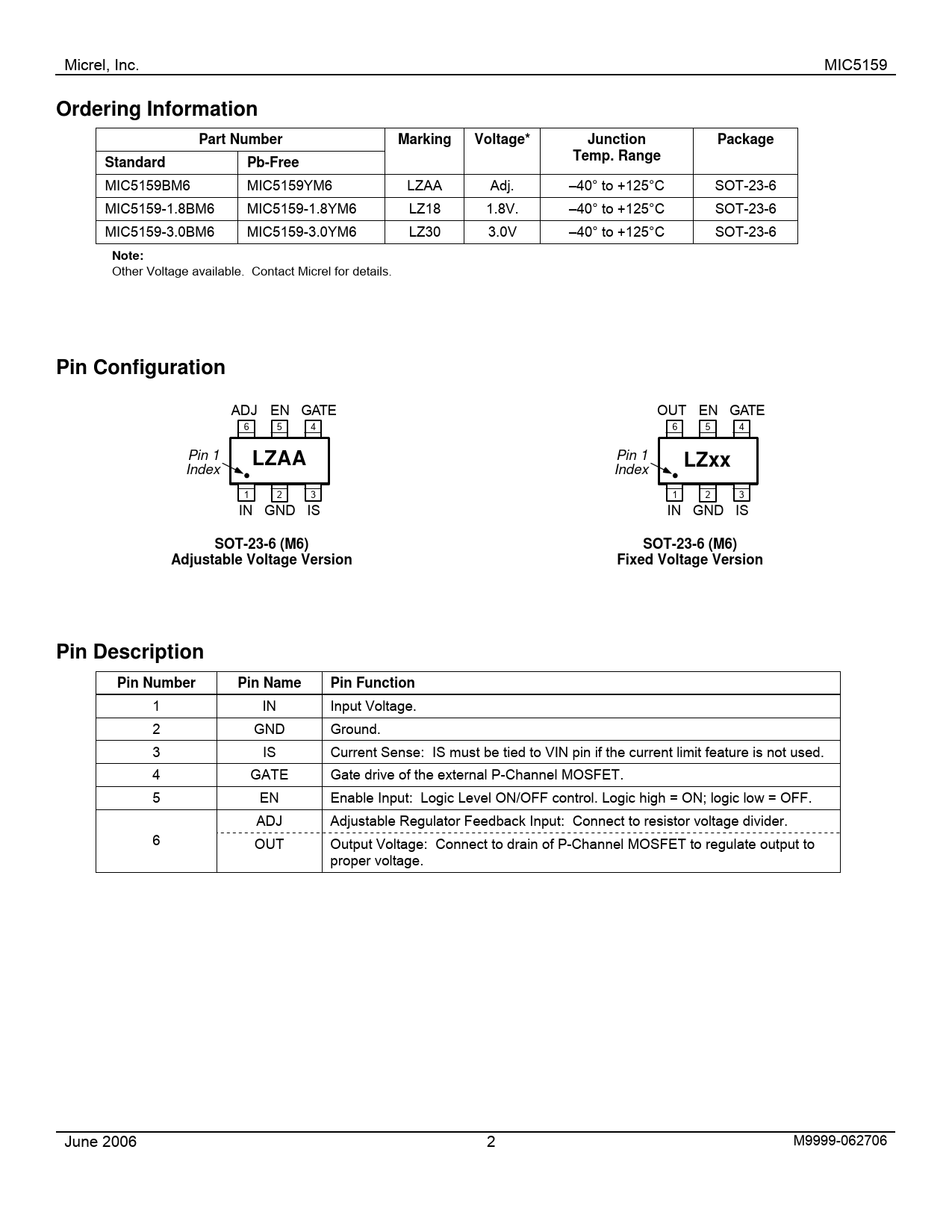 MIC5159BM6 MIC5159YM6 LZAA Adj. –40° to +125°C SOT-23-6 MIC5159-1.8BM6 MIC5159-1.8YM6 LZ18 1.8V. –40° to +125°C SOT-23-6 MIC5159-3.0BM6 MIC5159-3.0YM6 LZ30 3.0V –40° to +125°C SOT-23-6