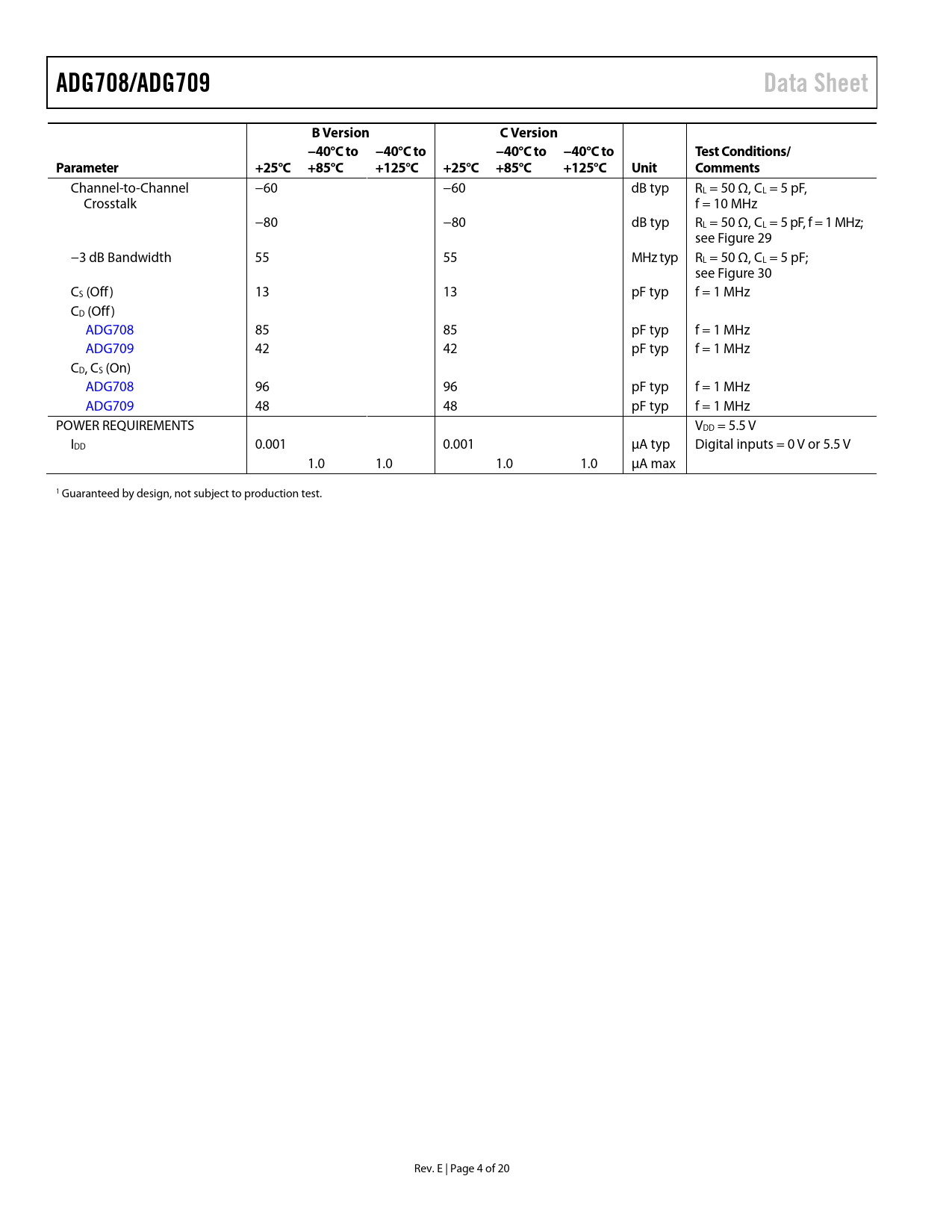 ADG708/ADG709. Data Sheet. B Version. C Version. −40°C to −40°C to. Test Conditions/. Parameter. +25°C +85°C. +125°C. Unit. Comments