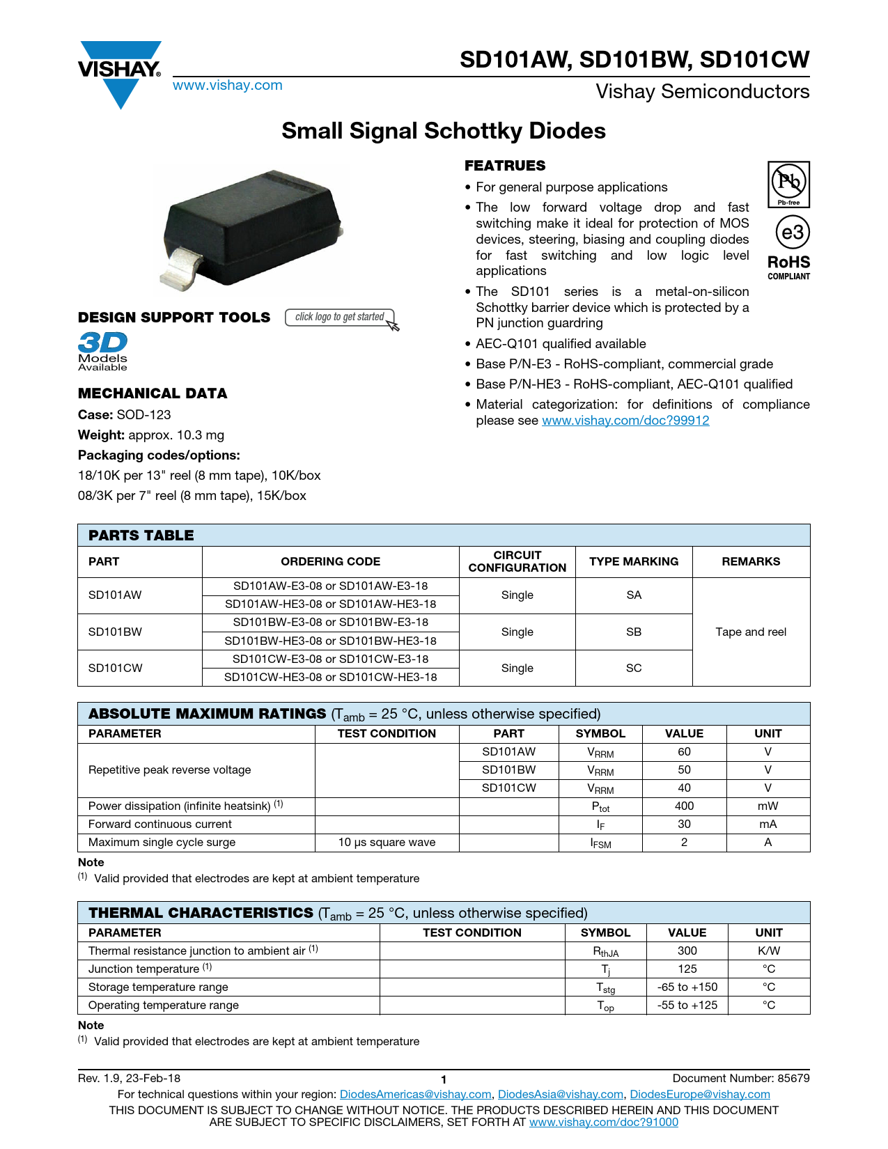 SD101AW, SD101BW, SD101CW www.vishay.com Vishay Semiconductors Small Signal Schottky DiodesFEATRUES • For general purpose applications • The low forward voltage drop and fast switching make it ideal for protection of MOS devices, steering, biasing and coupling diodes for fast switching and low logic level applications • The SD101 series is a metal-on-silicon Schottky barrier device which is protected by a DESIGN SUPPORT TOOLS click logo to get started PN junction guardring • AEC-Q101 qualified available Models Available • Base P/N-E3 - RoHS-compliant, commercial grade • Base P/N-HE3 - RoHS-compliant, AEC-Q101 qualified MECHANICAL DATA • Material categorization: for definitions of compliance Case: SOD-123 please see www.vishay.com/doc?99912 Weight: approx. 10.3 mg Packaging codes/options: 18/10K per 13" reel (8 mm tape), 10K/box 08/3K per 7" reel (8 mm tape), 15K/box PARTS TABLECIRCUITPARTORDERING CODETYPE MARKINGREMARKSCONFIGURATION SD101AW-E3-08 or SD101AW-E3-18 SD101AW Single SA SD101AW-HE3-08 or SD101AW-HE3-18 SD101BW-E3-08 or SD101BW-E3-18 SD101BW Single SB Tape and reel SD101BW-HE3-08 or SD101BW-HE3-18 SD101CW-E3-08 or SD101CW-E3-18 SD101CW Single SC SD101CW-HE3-08 or SD101CW-HE3-18 ABSOLUTE MAXIMUM RATINGS (Tamb = 25 °C, unless otherwise specified) PARAMETERTEST CONDITIONPARTSYMBOLVALUEUNIT SD101AW VRRM 60 V Repetitive peak reverse voltage SD101BW VRRM 50 V SD101CW VRRM 40 V Power dissipation (infinite heatsink) (1) Ptot 400 mW Forward continuous current IF 30 mA Maximum single cycle surge 10 μs square wave IFSM 2 A Note (1) Valid provided that electrodes are kept at ambient temperature THERMAL CHARACTERISTICS (Tamb = 25 °C, unless otherwise specified) PARAMETERTEST CONDITIONSYMBOLVALUEUNIT Thermal resistance junction to ambient air (1) RthJA 300 K/W Junction temperature (1) Tj 125 °C Storage temperature range Tstg -65 to +150 °C Operating temperature range Top -55 to +125 °C Note (1) Valid provided that electrodes are kept at ambient temperature Rev. 1.9, 23-Feb-18 1 Document Number: 85679 For technical questions within your region: DiodesAmericas@vishay.com, DiodesAsia@vishay.com, DiodesEurope@vishay.com THIS DOCUMENT IS SUBJECT TO CHANGE WITHOUT NOTICE. THE PRODUCTS DESCRIBED HEREIN AND THIS DOCUMENT ARE SUBJECT TO SPECIFIC DISCLAIMERS, SET FORTH AT www.vishay.com/doc?91000