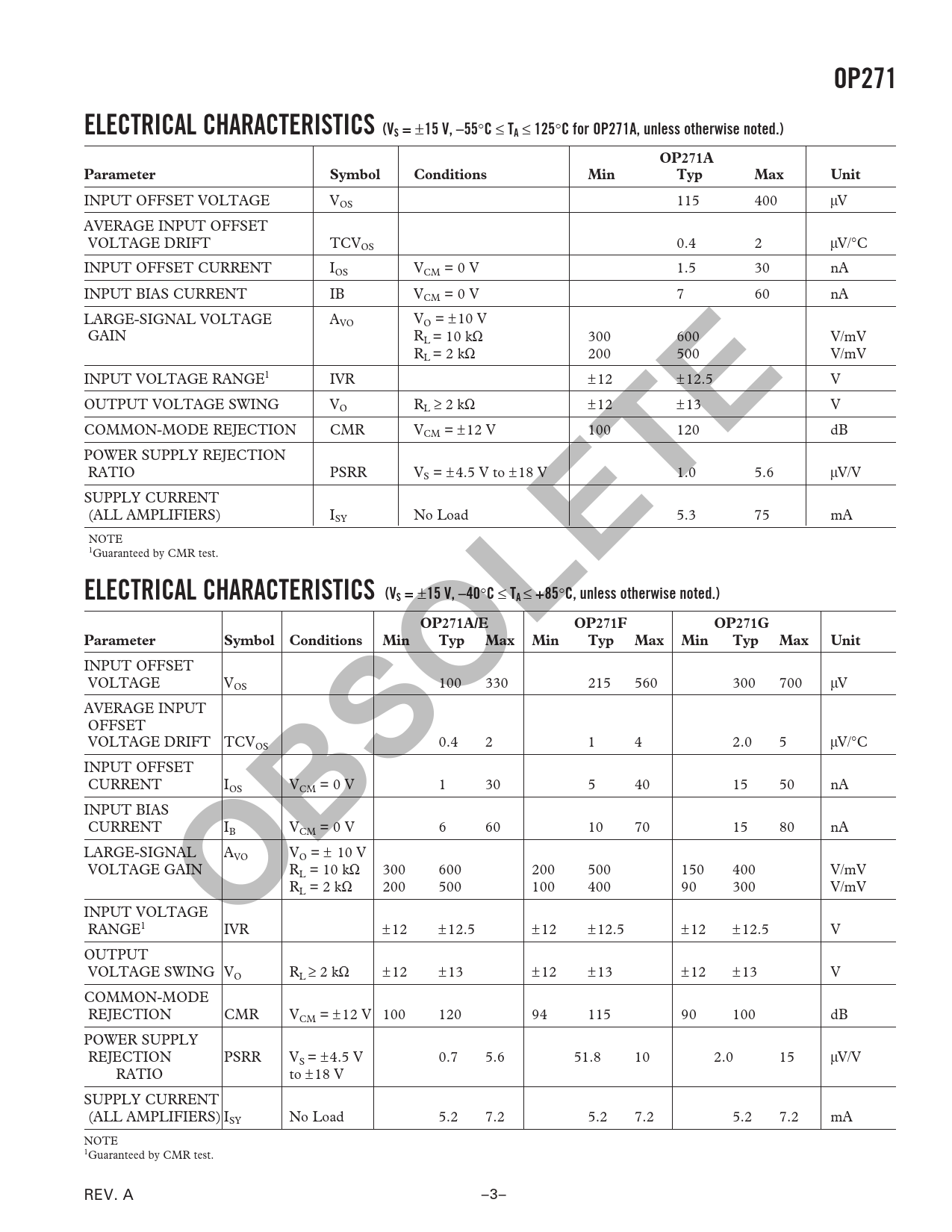 OP271ELECTRICAL CHARACTERISTICS (VS = ± 15 V, –55 ∞ C £ TA £ 125 ∞ C for OP271A, unless otherwise noted.)OP271AParameterSymbolConditionsMinTypMaxUnit INPUT OFFSET VOLTAGE VOS 115 400 mV AVERAGE INPUT OFFSET VOLTAGE DRIFT TCVOS 0.4 2 mV/∞C INPUT OFFSET CURRENT IOS VCM = 0 V 1.5 30 nA INPUT BIAS CURRENT IB VCM = 0 V 7 60 nA LARGE-SIGNAL VOLTAGE AVO VO = ± 10 V GAIN RL = 10 kW 300 600 V/mV RL = 2 kW 200 500 V/mV INPUT VOLTAGE RANGE1 IVR ±12 ±12.5 V OUTPUT VOLTAGE SWING VO RL ≥ 2 kW ±12 ±13 V COMMON-MODE REJECTION CMR VCM = ±12 V 100 120 dB POWER SUPPLY REJECTION RATIO PSRR VS = ± 4.5 V to ±18 V 1.0 5.6 mV/V SUPPLY CURRENT (ALL AMPLIFIERS) ISY No Load 5.3 75 mA NOTE 1Guaranteed by CMR test. ELECTRICAL CHARACTERISTICS (V £ S = ± 15 V, –40 ∞ C £ TA +85 ∞ C, unless otherwise noted.)OP271A/EOP271FOP271GParameterSymbolConditionsMinTypMaxMinTypMaxMinTypMaxUnit INPUT OFFSET VOLTAGE VOS 100 330 215 560 300 700 mV AVERAGE INPUT OFFSET VOLTAGE DRIFT TCVOS 0.4 2 1 4 2.0 5 mV/∞C INPUT OFFSET CURRENT IOS VCM = 0 V 1 30 5 40 15 50 nA INPUT BIAS CURRENT IB VCM = 0 V 6 60 10 70 15 80 nA LARGE-SIGNAL AVO VO = ± 10 V VOLTAGE GAIN RL = 10 kW 300 600 200 500 150 400 V/mV R OBSOLETE L = 2 kW 200 500 100 400 90 300 V/mV INPUT VOLTAGE RANGE1 IVR ±12 ±12.5 ±12 ±12.5 ±12 ±12.5 V OUTPUT VOLTAGE SWING VO RL ≥ 2 kW ±12 ±13 ±12 ±13 ±12 ±13 V COMMON-MODE REJECTION CMR VCM = ± 12 V 100 120 94 115 90 100 dB POWER SUPPLY REJECTION PSRR VS = ±4.5 V 0.7 5.6 51.8 10 2.0 15 mV/V RATIO to ±18 V SUPPLY CURRENT (ALL AMPLIFIERS) ISY No Load 5.2 7.2 5.2 7.2 5.2 7.2 mA NOTE 1Guaranteed by CMR test. REV. A –3– Document Outline FEATURES GENERAL DESCRIPTION PIN CONNECTIONS SPECIFICATIONS ABSOLUTE MAXIMUM RATINGS ORDERING GUIDE Typical Performance Characteristics APPLICATION INFORMATION Capacitive Load Driving and Power Supply Considerations Unity-Gain Buffer Applications Computer Simulations APPLICATIONS Low Phase Error Amplifier Dual 12-Bit Voltage Output DAC Fast Current Pump OUTLINE DIMENSIONS Revision History