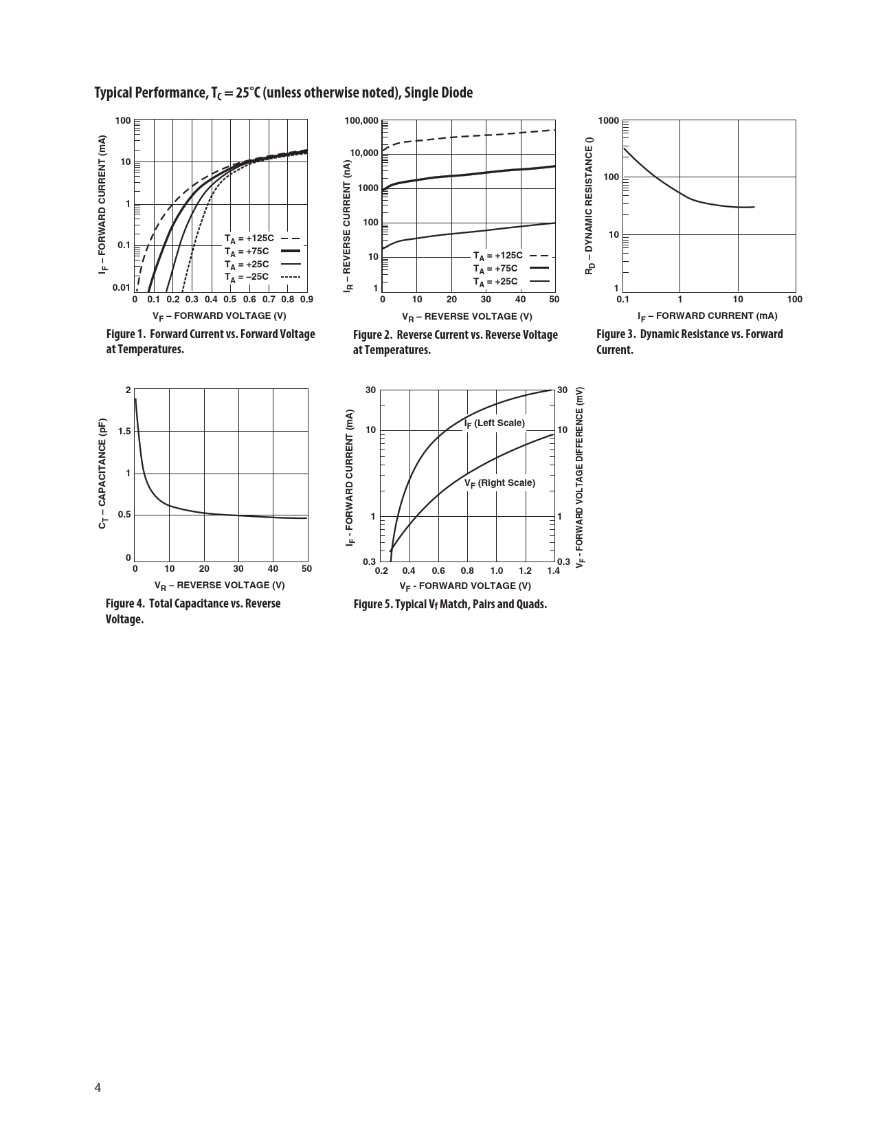 Typical Performance, TC = 25°C (unless otherwise noted), Single Diode 100 100,000 1000 10,000 10 100 1000 1 100 T = +125C 10 0.1 A T = +75C A 10 T = +125C A – FORWARD CURRENT (mA) – DYNAMIC RESISTANCE () T = +25C D I F A T = +75C A R T = –25C A – REVERSE CURRENT (nA) T = +25C 0.01 A I R 1 1 0 0.1 0.2 0.3 0.4 0.5 0.6 0.7 0.8 0.9 0 10 20 30 40 50 0.1 1 10 100 VF – FORWARD VOLTAGE (V) VR – REVERSE VOLTAGE (V) IF – FORWARD CURRENT (mA) Figure 1. Forward Current vs. Forward Voltage Figure 2. Reverse Current vs. Reverse Voltage Figure 3. Dynamic Resistance vs. Forward at Temperatures. at Temperatures. Current. 2 30 30 IF (Left Scale) 1.5 10 10 1 VF (Right Scale) – CAPACITANCE (pF) 0.5 T 1 1 C - FORWARD CURRENT (mA) I F 0 - FORWARD VOLTAGE DIFFERENCE (mV) 0.3 0.3 F 0 10 20 30 40 50 V 0.2 0.4 0.6 0.8 1.0 1.2 1.4 VR – REVERSE VOLTAGE (V) VF - FORWARD VOLTAGE (V) Figure 4. Total Capacitance vs. Reverse Figure 5. Typical Vf Match, Pairs and Quads. Voltage.