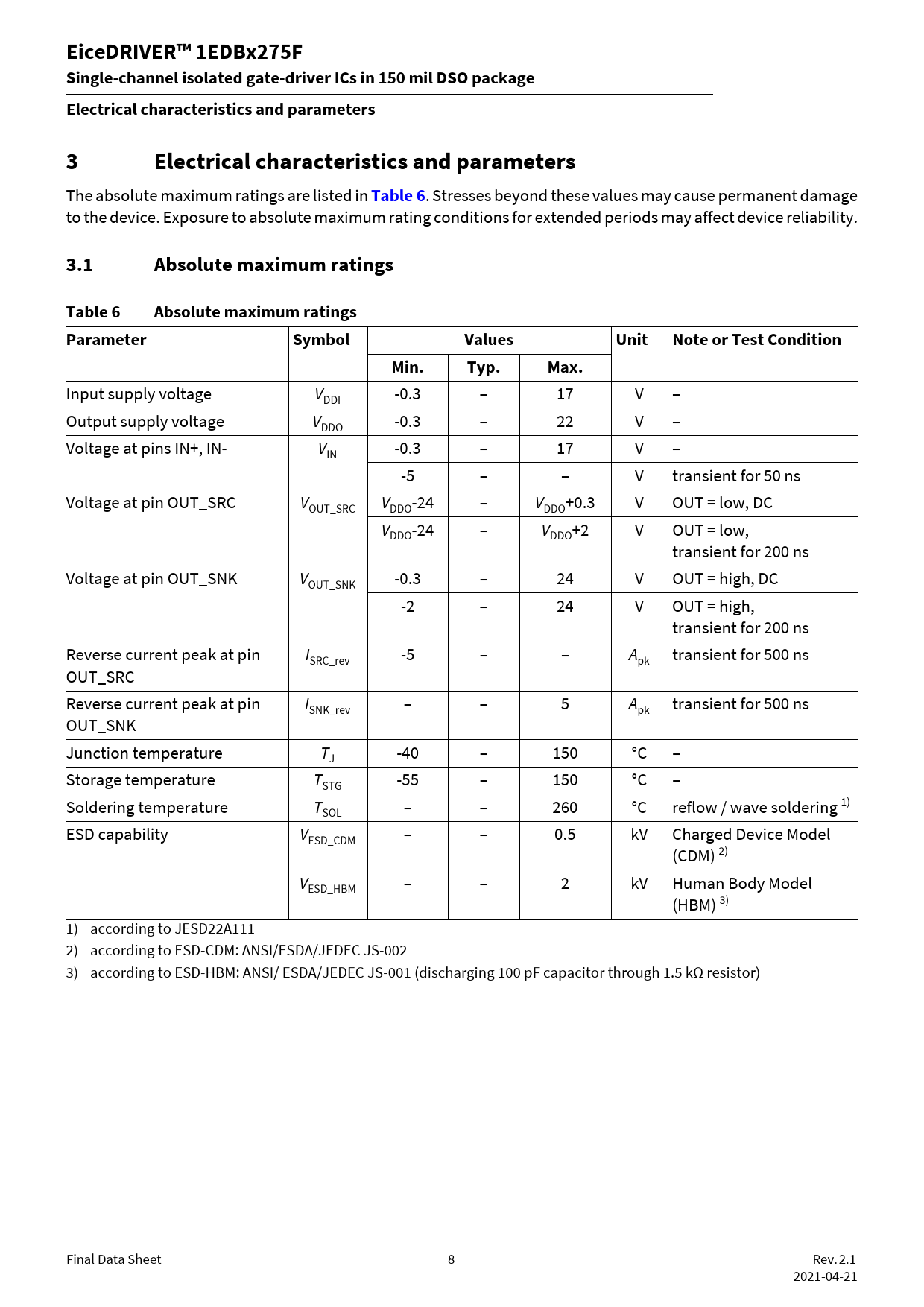 Input supply voltage VDDI -0.3 – 17 V – Output supply voltage VDDO -0.3 – 22 V – Voltage at pins IN+, IN- VIN -0.3 – 17 V – -5 – – V transient for 50 ns Voltage at pin OUT_SRC VOUT_SRC VDDO-24 – VDDO+0.3 V OUT = low, DC VDDO-24 – VDDO+2 V OUT = low, transient for 200 ns Voltage at pin OUT_SNK VOUT_SNK -0.3 – 24 V OUT = high, DC -2 – 24 V OUT = high, transient for 200 ns Reverse current peak at pin ISRC_rev -5 – – Apk transient for 500 ns OUT_SRC Reverse current peak at pin ISNK_rev – – 5 Apk transient for 500 ns OUT_SNK Junction temperature TJ -40 – 150 °C – Storage temperature TSTG -55 – 150 °C – Soldering temperature TSOL – – 260 °C reflow / wave soldering 1) ESD capability VESD_CDM – – 0.5 kV Charged Device Model (CDM) 2) VESD_HBM – – 2 kV Human Body Model (HBM) 3) 1) according to JESD22A111 2) according to ESD-CDM: ANSI/ESDA/JEDEC JS-002 3) according to ESD-HBM: ANSI/ ESDA/JEDEC JS-001 (discharging 100 pF capacitor through 1.5 kΩ resistor) Final Data Sheet 8 Rev. 2.1 2021-04-21 Document Outline Description Table of Contents 1 Pin configuration and description 2 Functional description 2.1 Block diagram 2.2 Power supply and Undervoltage Lockout (UVLO) 2.2.1 Input supply voltage 2.2.2 Output supply voltage 2.2.3 Input stage 2.3 Driver output 2.4 Output active clamping 2.5 CT communication and input to output data transmission 3 Electrical characteristics and parameters 3.1 Absolute maximum ratings 3.2 Thermal characteristics 3.3 Operating range 3.4 Electrical characteristics 3.5 Isolation specifications 4 Timing diagrams 5 Layout recommendation 6 Application notes 6.1 Driving 600 V CoolGaNTM 6.2 Driving 650 V CoolSiCTM 7 Typical characteristics 8 Package outline dimensions 8.1 Device numbers and markings 8.2 Package PG-DSO-8 Revision history