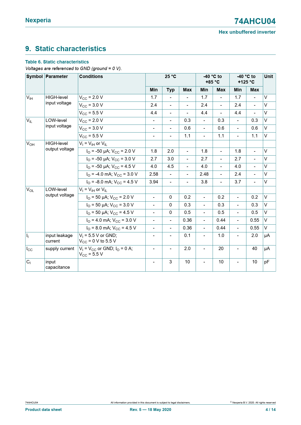 Nexperia. 74AHCU04. Hex unbuffered inverter. 9. Static characteristics Table 6. Static characteristics. Symbol Parameter