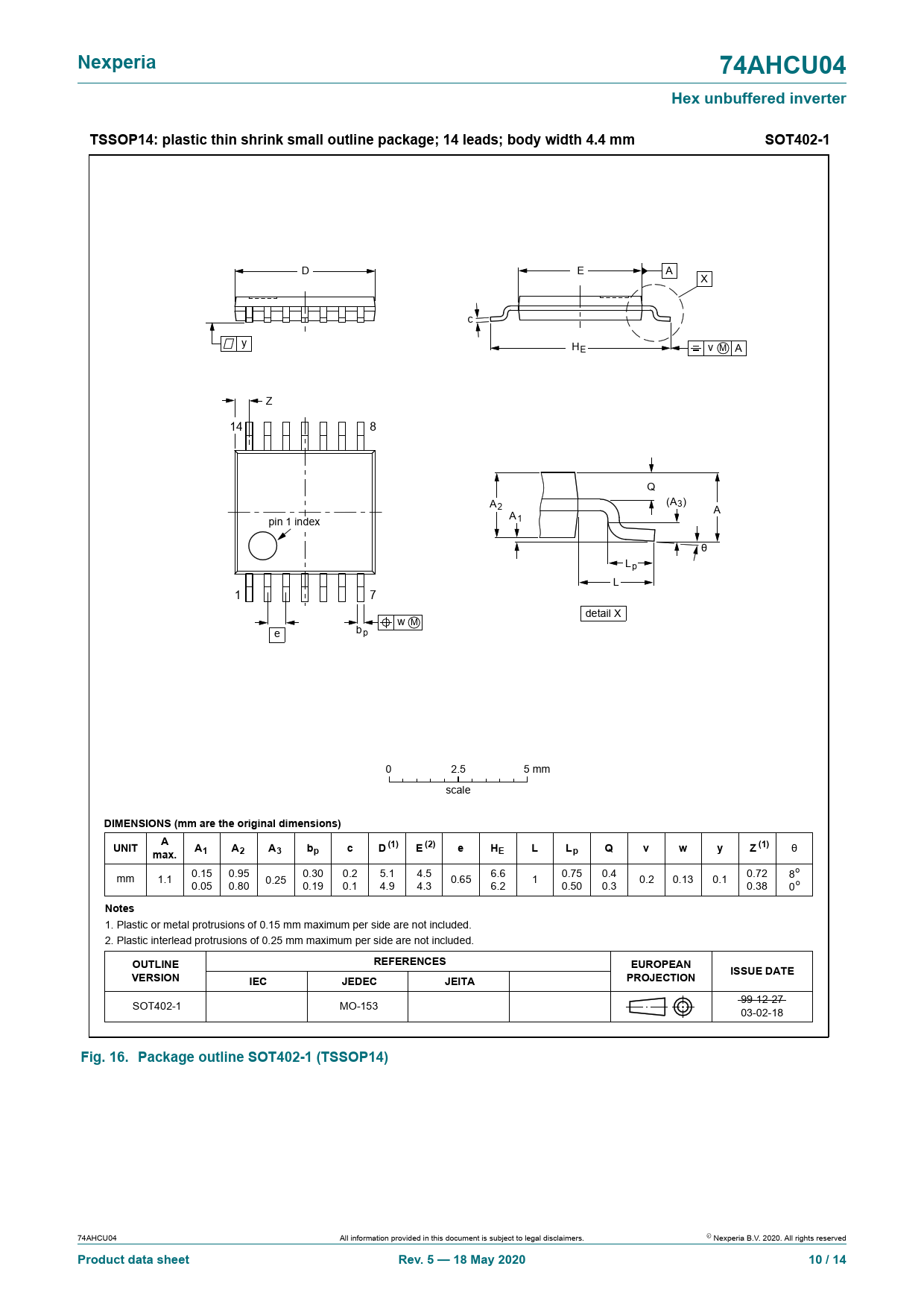Nexperia. 74AHCU04. Hex unbuffered inverter. TSSOP14: plastic thin shrink smal outline package; 14 leads; body width 4.4 mm