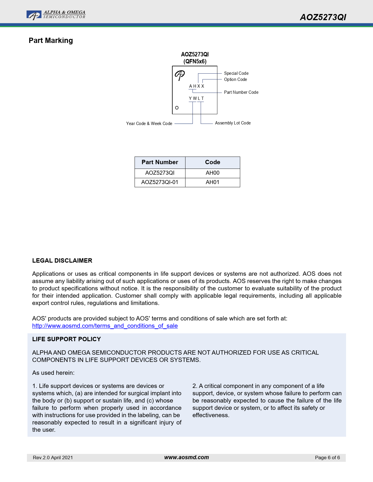 AOZ5273QI Part Marking (QFN5x6) Part Number Code LEGAL DISCLAIMER LIFE SUPPORT POLICY www.aosmd.com