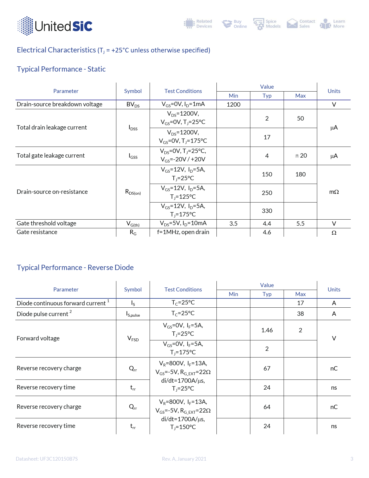 Electrical Characteristics (TJ = +25°C unless otherwise specified) Typical Performance - Static Value Parameter Symbol Test Conditions Units Min Typ Max Drain-source breakdown voltage BVDS VGS=0V, ID=1mA 1200 V VDS=1200V, 2 50 V Total drain leakage current I GS=0V, TJ=25°C DSS mA VDS=1200V, 17 VGS=0V, TJ=175°C V Total gate leakage current I DS=0V, TJ=25°C, GSS 4 20 mA VGS=-20V / +20V VGS=12V, ID=5A, 150 180 TJ=25°C V Drain-source on-resistance R GS=12V, ID=5A, DS(on) 250 mW TJ=125°C VGS=12V, ID=5A, 330 TJ=175°C Gate threshold voltage VG(th) VDS=5V, ID=10mA 3.5 4.4 5.5 V Gate resistance RG f=1MHz, open drain 4.6 W Typical Performance - Reverse Diode Value Parameter Symbol Test Conditions Units Min Typ Max Diode continuous forward current 1 IS TC=25°C 17 A Diode pulse current 2 IS,pulse TC=25°C 38 A VGS=0V, IF=5A, 1.46 2 T Forward voltage V J=25°C FSD V VGS=0V, IF=5A, 2 TJ=175°C V Reverse recovery charge Q R=800V, IF=13A, rr 67 nC VGS=-5V, RG_EXT=22W di/dt=1700A/ms, Reverse recovery time trr T 24 ns J=25°C V Reverse recovery charge Q R=800V, IF=13A, rr 64 nC VGS=-5V, RG_EXT=22W di/dt=1700A/ms, Reverse recovery time trr T 24 ns J=150°C Datasheet: UF3C120150B7S Rev. A, January 2021 3
