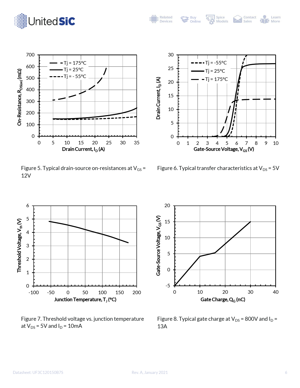 700 30 Tj = 175°C Tj = -55°C 600 ) 25 W Tj = 25°C Tj = 25°C (m 500 Tj = - 55°C ) Tj = 175°C n) A( o 20 (S I D 400 , R D , nt ec er 15 300 r ant Cu is s n 10 e 200 ai R r - D On 100 5 0 0 0 5 10 15 20 25 30 35 0 1 2 3 4 5 6 7 8 9 10 Drain Current, ID (A) Gate-Source Voltage, VGS (V) Figure 5. Typical drain-source on-resistances at VGS = Figure 6. Typical transfer characteristics at VDS = 5V 12V 6 20 ) 5 V V ( 15 V th V GS , 4 , e e g g 10 lta lta o 3 o V V d ec ol r 5 h 2 s ou e S r - Th te 0 1 Ga 0 -5 -100 -50 0 50 100 150 200 0 10 20 30 40 Junction Temperature, TJ (°C) Gate Charge, QG (nC) Figure 7. Threshold voltage vs. junction temperature Figure 8. Typical gate charge at VDS = 800V and ID = at VDS = 5V and ID = 10mA 13A Datasheet: UF3C120150B7S Rev. A, January 2021 6