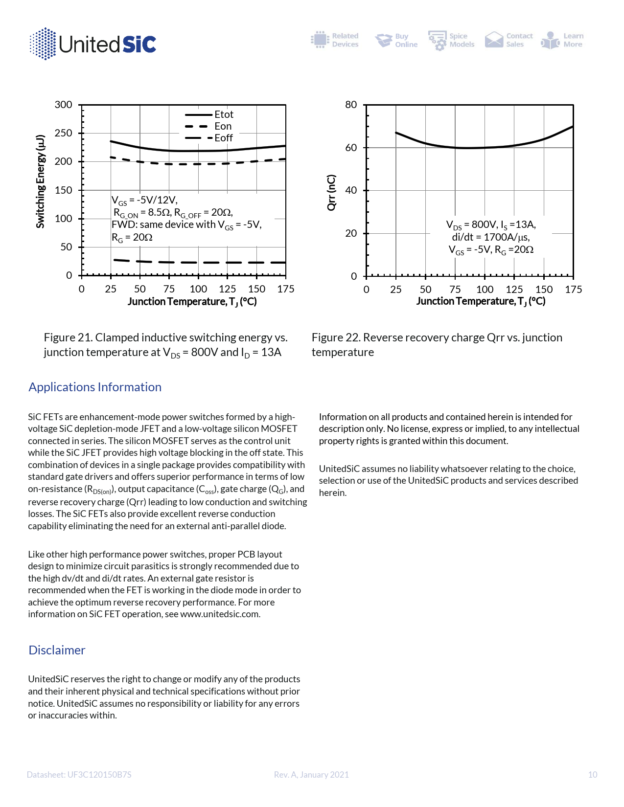 300 80 Etot Eon 250 J) Eoff ( m 60 ygr 200 en ) E C g n n 150 ( 40 hi V r GS = -5V/12V, itc R Qr 100 G_ON = 8.5W, RG_OFF = 20W, Sw FWD: same device with VGS = -5V, VDS = 800V, IS =13A, R 20 G = 20W di/dt = 1700A/ms, 50 VGS = -5V, RG =20W 0 0 0 25 50 75 100 125 150 175 0 25 50 75 100 125 150 175 Junction Temperature, T Junction Temperature, T J (°C) J (°C) Figure 21. Clamped inductive switching energy vs. Figure 22. Reverse recovery charge Qrr vs. junction junction temperature at VDS = 800V and ID = 13A temperature Applications Information SiC FETs are enhancement-mode power switches formed by a high- Information on all products and contained herein is intended for voltage SiC depletion-mode JFET and a low-voltage silicon MOSFET description only. No license, express or implied, to any intellectual connected in series. The silicon MOSFET serves as the control unit property rights is granted within this document. while the SiC JFET provides high voltage blocking in the off state. This combination of devices in a single package provides compatibility with UnitedSiC assumes no liability whatsoever relating to the choice, standard gate drivers and offers superior performance in terms of low selection or use of the UnitedSiC products and services described on-resistance (RDS(on)), output capacitance (Coss), gate charge (QG), and herein. reverse recovery charge (Qrr) leading to low conduction and switching losses. The SiC FETs also provide excellent reverse conduction capability eliminating the need for an external anti-parallel diode. Like other high performance power switches, proper PCB layout design to minimize circuit parasitics is strongly recommended due to the high dv/dt and di/dt rates. An external gate resistor is recommended when the FET is working in the diode mode in order to achieve the optimum reverse recovery performance. For more information on SiC FET operation, see www.unitedsic.com. Disclaimer UnitedSiC reserves the right to change or modify any of the products and their inherent physical and technical specifications without prior notice. UnitedSiC assumes no responsibility or liability for any errors or inaccuracies within. Datasheet: UF3C120150B7S Rev. A, January 2021 10