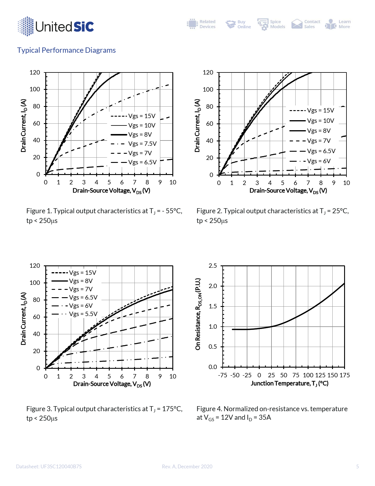 Typical Performance Diagrams 120 120 100 100 ) A( A 80 ( 80 I , D I , D Vgs = 15V nt Vgs = 15V e nt r 60 e Vgs = 10V r Vgs = 10V r 60 r Cu Vgs = 8V Vgs = 8V Cu n 40 n ai 40 Vgs = 7V r Vgs = 7.5V air D Vgs = 7V D Vgs = 6.5V 20 20 Vgs = 6.5V Vgs = 6V 0 0 0 1 2 3 4 5 6 7 8 9 10 0 1 2 3 4 5 6 7 8 9 10 Drain-Source Voltage, VDS (V) Drain-Source Voltage, VDS (V) Figure 1. Typical output characteristics at TJ = - 55°C, Figure 2. Typical output characteristics at TJ = 25°C, tp < 250ms tp < 250ms 120 2.5 Vgs = 15V ). 100 Vgs = 8V U. 2.0 ) Vgs = 7V P( A( N 80 Vgs = 6.5V _O I S , D Vgs = 6V 1.5 nt R D , er e 60 Vgs = 5.5V r c an Cu st 1.0 n 40 si ai e r R D On 0.5 20 0 0.0 0 1 2 3 4 5 6 7 8 9 10 -75 -50 -25 0 25 50 75 100 125 150 175 Drain-Source Voltage, V Junction Temperature, T DS (V) J (°C) Figure 3. Typical output characteristics at TJ = 175°C, Figure 4. Normalized on-resistance vs. temperature tp < 250ms at VGS = 12V and ID = 35A Datasheet: UF3SC120040B7S Rev. A, December 2020 5
