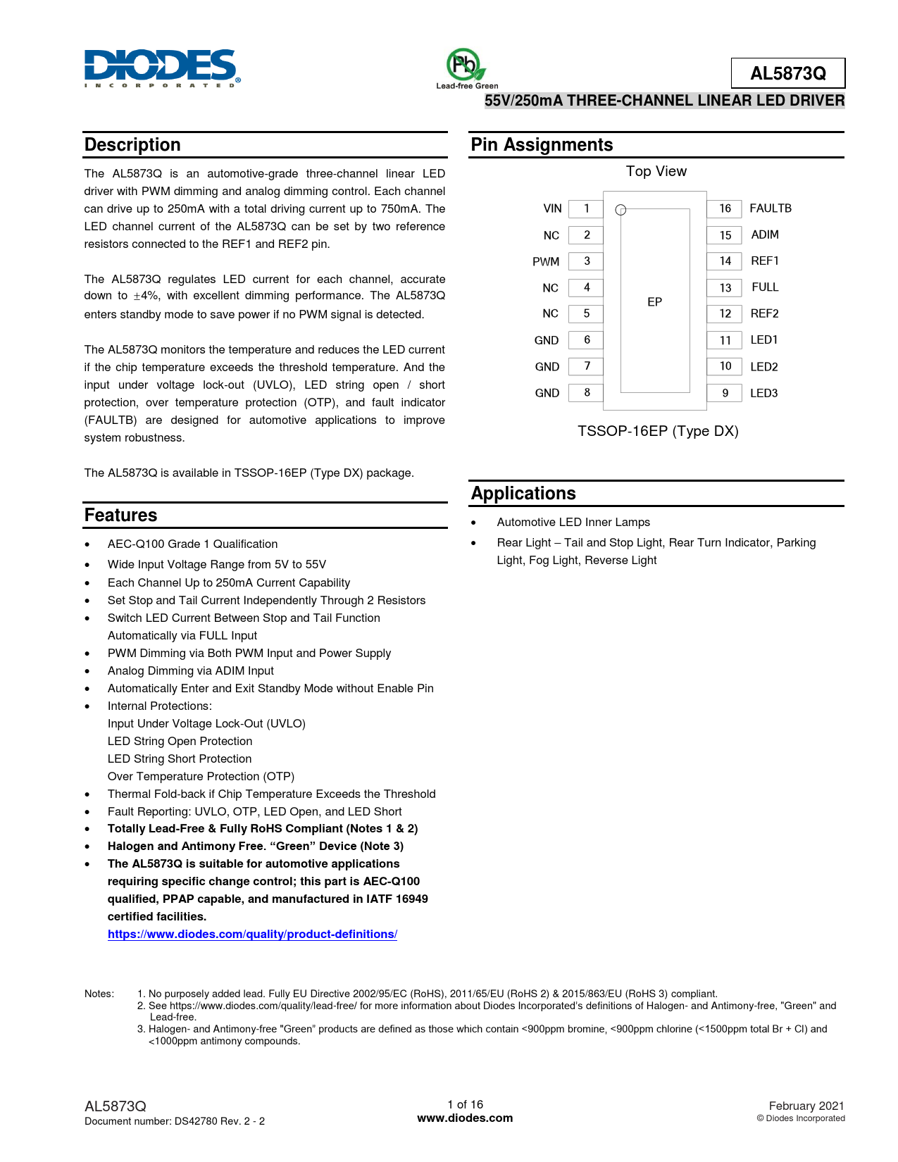 | Seiten / Seite | 16 / 1 — AL5873Q. 55V/250mA THREE-CHANNEL LINEAR LED DRIVER. Description. Pin … |