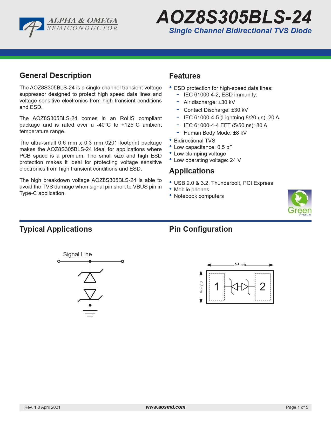 Seiten / Seite5 / 1 — ALPHA & OMEGA. AOZ8S305BLS-24. Single Channel Bidirectional TVS …