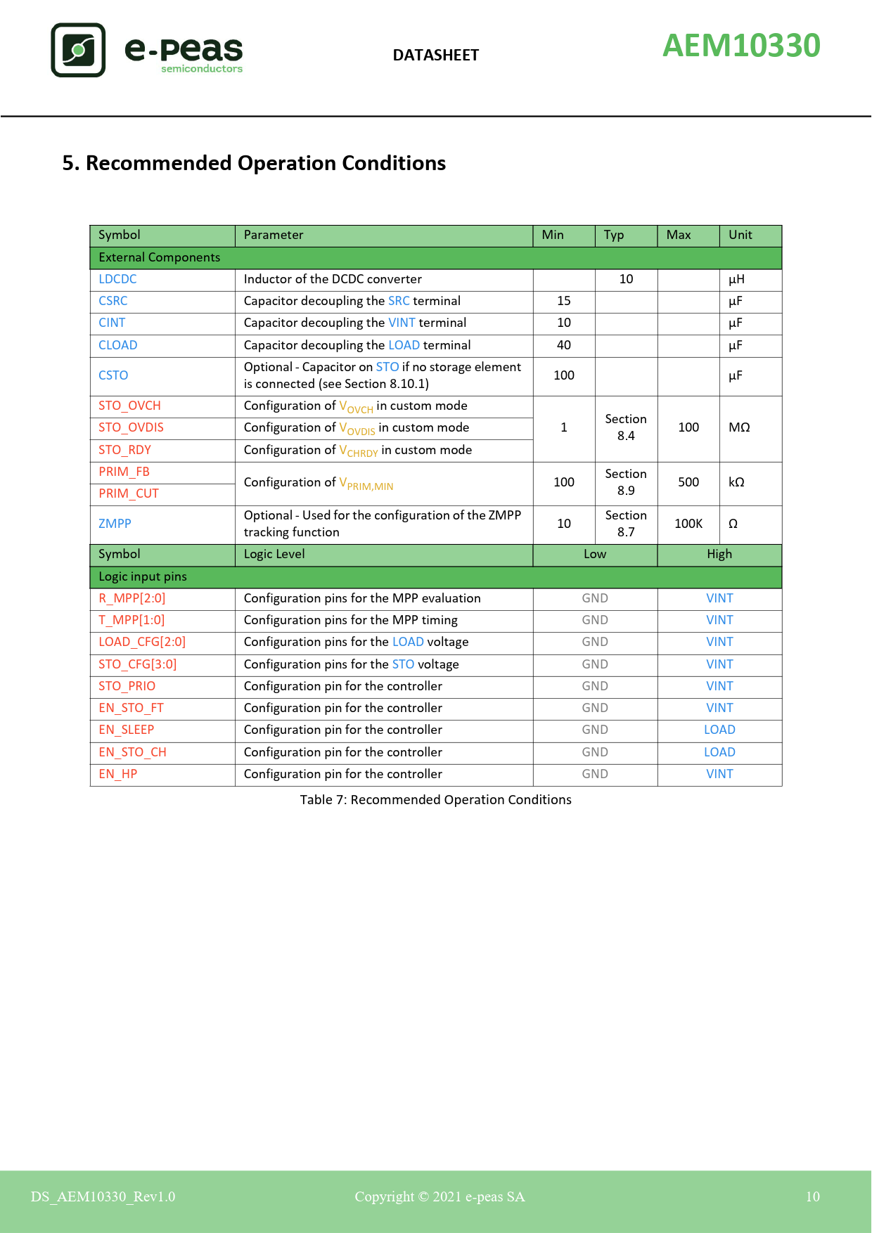 | Seiten / Seite | 33 / 10 — DATASHEET. AEM10330. 5. Recommended Operation Conditions |