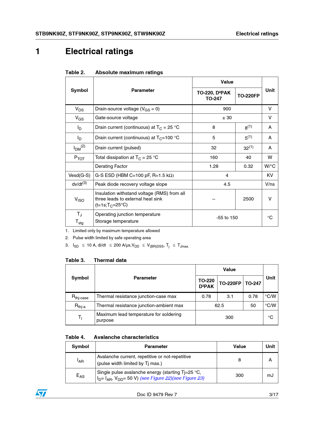 link to page 9 link to page 9 STB9NK90Z, STF9NK90Z, STP9NK90Z, STW9NK90ZElectrical ratings1 ElectricalratingsTable 2.Absolute maximum ratingsValueSymbolParameterUnitTO-220, D²PAKTO-220FPTO-247 VDS Drain-source voltage (VGS = 0) 900 V VGS Gate-source voltage ± 30 V ID Drain current (continuous) at TC = 25 °C 8 8(1) A ID Drain current (continuous) at TC=100 °C 5 5(1) A I (2) DM Drain current (pulsed) 32 32(1) A PTOT Total dissipation at TC = 25 °C 160 40 W Derating Factor 1.28 0.32 W/°C Vesd(G-S) G-S ESD (HBM C=100 pF, R=1.5 kΩ) 4 KV dv/dt(3) Peak diode recovery voltage slope 4.5 V/ns Insulation withstand voltage (RMS) from all VISO three leads to external heat sink -- 2500 V (t=1s;TC=25°C) TJ Operating junction temperature -55 to 150 °C T Storage temperature stg 1. Limited only by maximum temperature allowed 2. Pulse width limited by safe operating area 3. ISD ≤ 10 A, di/dt ≤ 200 A/µs,VDD ≤ V(BR)DSS, Tj ≤ TJmax. Table 3.Thermal dataValueSymbolParameterUnitTO-220 TO-220FP TO-247D²PAK Rthj-case Thermal resistance junction-case max 0.78 3.1 0.78 °C/W Rthj-a Thermal resistance junction-ambient max 62.5 50 °C/W Maximum lead temperature for soldering Tl 300 °C purpose Table 4.Avalanche characteristicsSymbolParameterValueUnit Avalanche current, repetitive or not-repetitive IAR 8 A (pulse width limited by Tj max.) Single pulse avalanche energy (starting Tj=25 °C, EAS ID= IAR, VDD= 50 V) (see Figure 22)(see Figure 23) 300 mJ Doc ID 9479 Rev 7 3/17 Document Outline Figure 1. Internal schematic diagram Table 1. Device summary 1 Electrical ratings Table 2. Absolute maximum ratings Table 3. Thermal data Table 4. Avalanche characteristics 2 Electrical characteristics Table 5. On/off states Table 6. Dynamic Table 7. Switching times Table 8. Source drain diode Table 9. Gate-source Zener diode 2.1 Electrical characteristics (curves) Figure 2. Safe operating area for TO-220, D·PAK Figure 3. Thermal impedance for TO-220, D·PAK Figure 4. Safe operating area for TO-220FP Figure 5. Thermal impedance for TO-220FP Figure 6. Safe operating area for TO-247 Figure 7. Thermal impedance for TO-247 Figure 8. Output characteristics Figure 9. Transfer characteristics Figure 10. Transconductance Figure 11. Static drain-source on resistance Figure 12. Gate charge vs gate-source voltage Figure 13. Capacitance variations Figure 14. Normalized gate threshold voltage vs temperature Figure 15. Normalized on resistance vs temperature Figure 16. Source-drain diode forward characteristics Figure 17. Normalized BVDSS vs temperature Figure 18. Maximum avalanche energy vs temperature 3 Test circuits Figure 19. Switching times test circuit for resistive load Figure 20. Gate charge test circuit Figure 21. Test circuit for inductive load switching and diode recovery times Figure 22. Unclamped Inductive load test circuit Figure 23. Unclamped inductive waveform Figure 24. Switching time waveform 4 Package mechanical data Table 10. TO-220FP mechanical data Figure 25. TO-220FP drawing 5 Packaging mechanical data 6 Revision history Table 11. Revision history