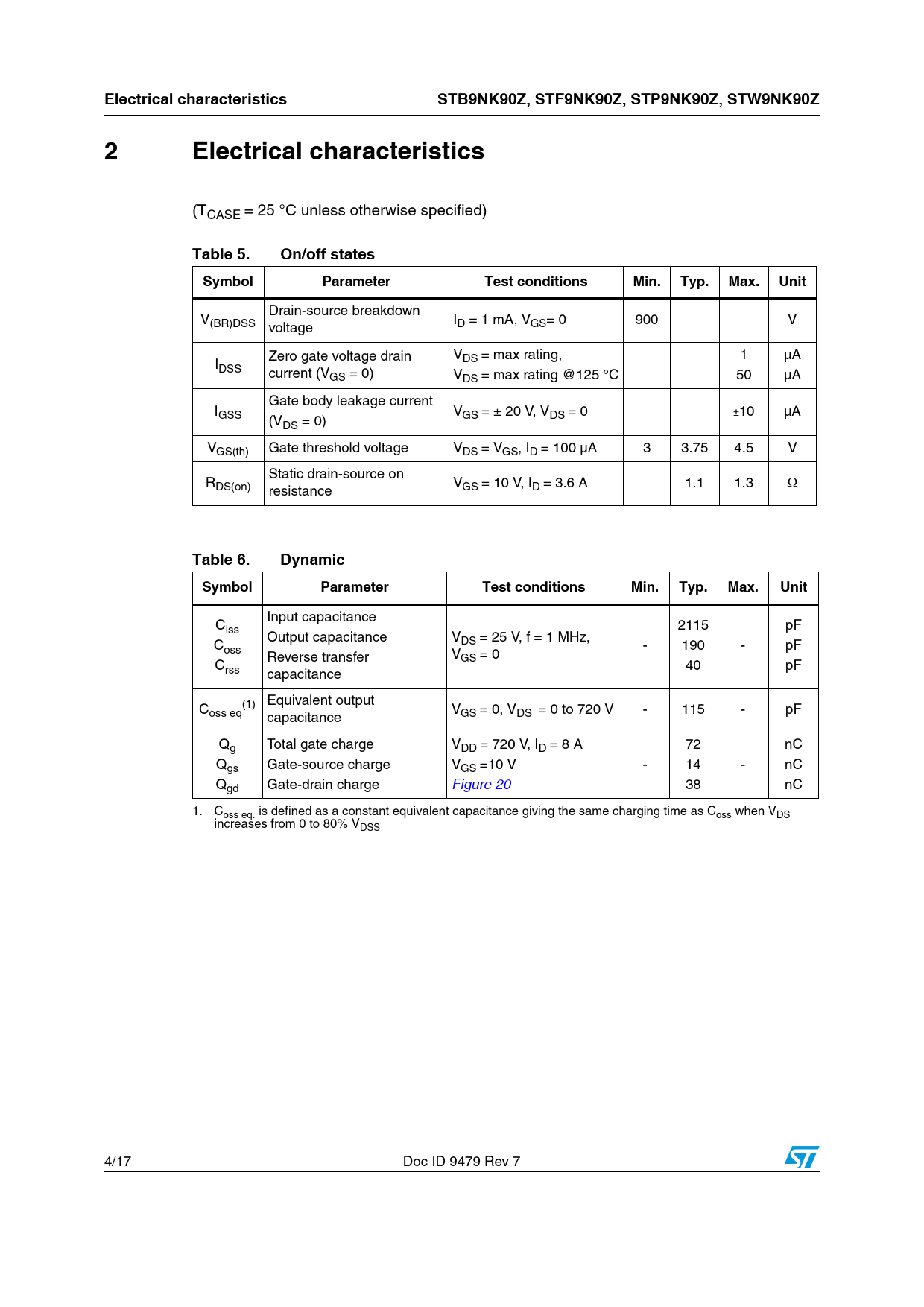 Electrical characteristics. STB9NK90Z, STF9NK90Z, STP9NK90Z, STW9NK90Z. 2 Electrical. characteristics. Table 5. On/off states