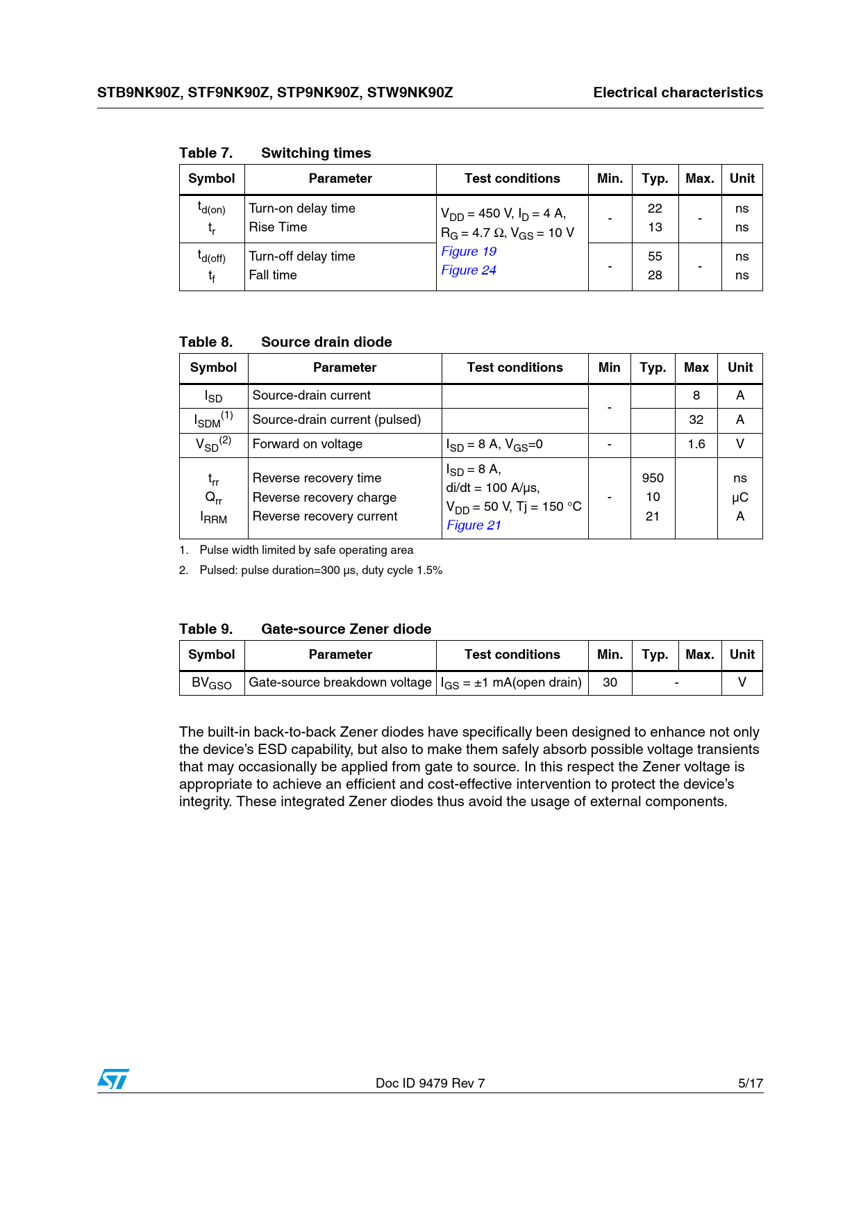 link to page 9 link to page 9 link to page 9 STB9NK90Z, STF9NK90Z, STP9NK90Z, STW9NK90ZElectrical characteristicsTable 7.Switching timesSymbolParameterTest conditionsMin.Typ.Max.Unit td(on) Turn-on delay time V 22 ns DD = 450 V, ID = 4 A, - - tr Rise Time R 13 ns G = 4.7 Ω, VGS = 10 V Figure 19 td(off) Turn-off delay time 55 ns Figure 24 - - tf Fall time 28 ns Table 8.Source drain diodeSymbolParameterTest conditionsMinTyp.MaxUnit ISD Source-drain current 8 A - I (1) SDM Source-drain current (pulsed) 32 A V (2) SD Forward on voltage ISD = 8 A, VGS=0 - 1.6 V I t SD = 8 A, rr Reverse recovery time 950 ns di/dt = 100 A/µs, Qrr Reverse recovery charge - 10 µC V I DD = 50 V, Tj = 150 °C RRM Reverse recovery current 21 A Figure 21 1. Pulse width limited by safe operating area 2. Pulsed: pulse duration=300 µs, duty cycle 1.5% Table 9.Gate-source Zener diodeSymbolParameterTest conditionsMin.Typ.Max.Unit BVGSO Gate-source breakdown voltage IGS = ±1 mA(open drain) 30 - V The built-in back-to-back Zener diodes have specifically been designed to enhance not only the device’s ESD capability, but also to make them safely absorb possible voltage transients that may occasionally be applied from gate to source. In this respect the Zener voltage is appropriate to achieve an efficient and cost-effective intervention to protect the device’s integrity. These integrated Zener diodes thus avoid the usage of external components. Doc ID 9479 Rev 7 5/17 Document Outline Figure 1. Internal schematic diagram Table 1. Device summary 1 Electrical ratings Table 2. Absolute maximum ratings Table 3. Thermal data Table 4. Avalanche characteristics 2 Electrical characteristics Table 5. On/off states Table 6. Dynamic Table 7. Switching times Table 8. Source drain diode Table 9. Gate-source Zener diode 2.1 Electrical characteristics (curves) Figure 2. Safe operating area for TO-220, D·PAK Figure 3. Thermal impedance for TO-220, D·PAK Figure 4. Safe operating area for TO-220FP Figure 5. Thermal impedance for TO-220FP Figure 6. Safe operating area for TO-247 Figure 7. Thermal impedance for TO-247 Figure 8. Output characteristics Figure 9. Transfer characteristics Figure 10. Transconductance Figure 11. Static drain-source on resistance Figure 12. Gate charge vs gate-source voltage Figure 13. Capacitance variations Figure 14. Normalized gate threshold voltage vs temperature Figure 15. Normalized on resistance vs temperature Figure 16. Source-drain diode forward characteristics Figure 17. Normalized BVDSS vs temperature Figure 18. Maximum avalanche energy vs temperature 3 Test circuits Figure 19. Switching times test circuit for resistive load Figure 20. Gate charge test circuit Figure 21. Test circuit for inductive load switching and diode recovery times Figure 22. Unclamped Inductive load test circuit Figure 23. Unclamped inductive waveform Figure 24. Switching time waveform 4 Package mechanical data Table 10. TO-220FP mechanical data Figure 25. TO-220FP drawing 5 Packaging mechanical data 6 Revision history Table 11. Revision history