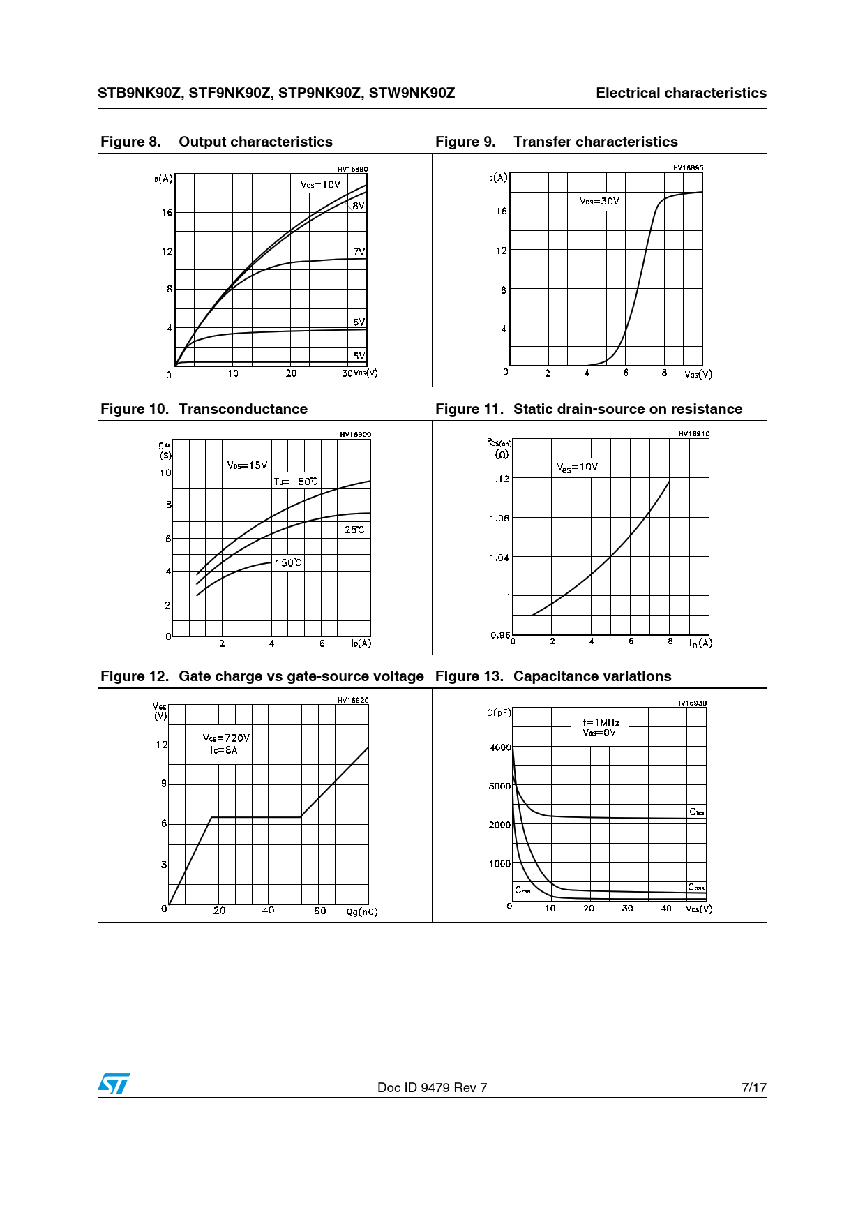 STB9NK90Z, STF9NK90Z, STP9NK90Z, STW9NK90Z Electrical characteristics Figure 8. Output characteristics Figure 9. Transfer characteristics Figure 10. Transconductance Figure 11. Static drain-source on resistance Figure 12. Gate charge vs gate-source voltage Figure 13. Capacitance variations