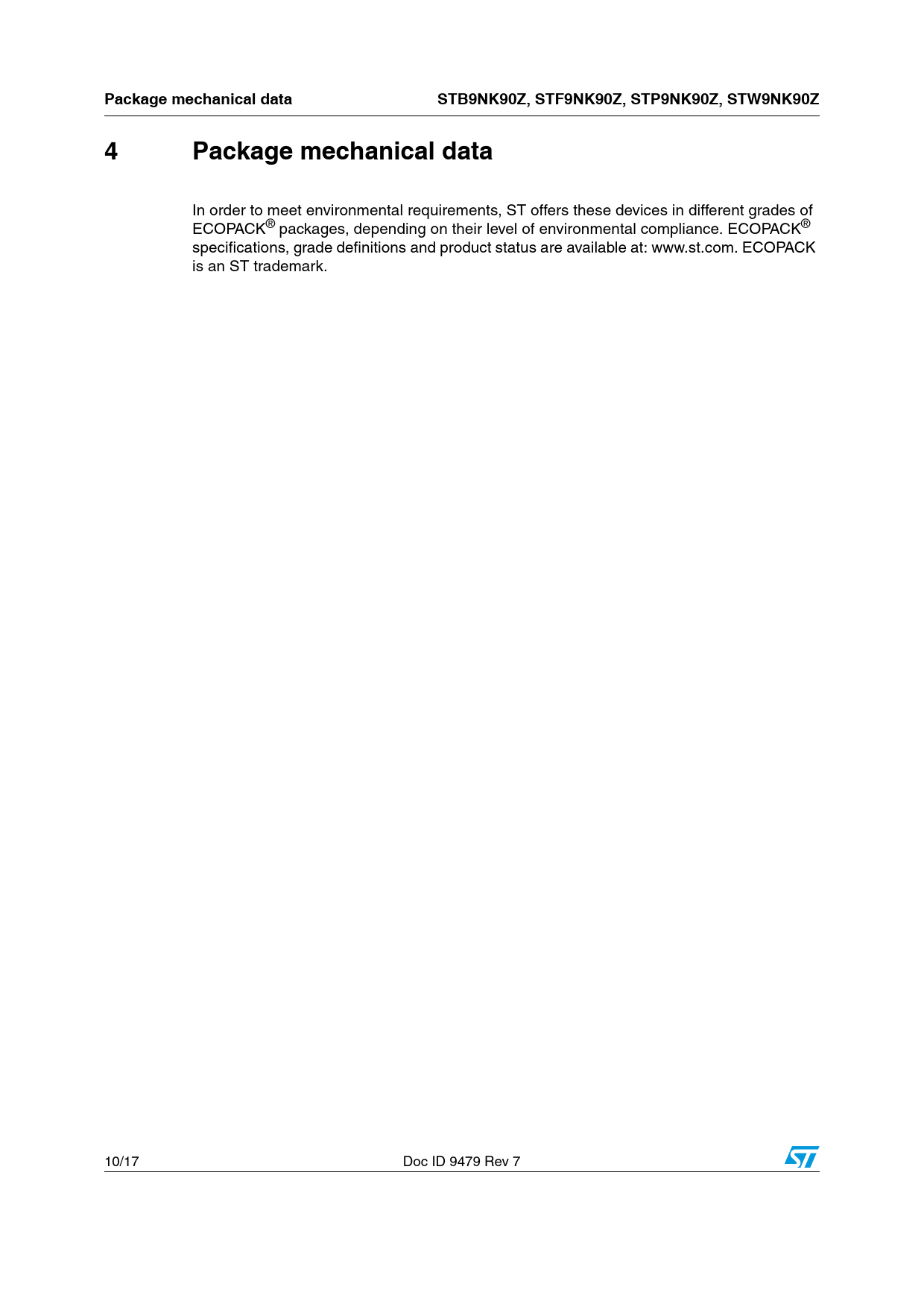 Seiten / Seite17 / 10 — Package mechanical data. STB9NK90Z, STF9NK90Z, STP9NK90Z, STW9NK90Z