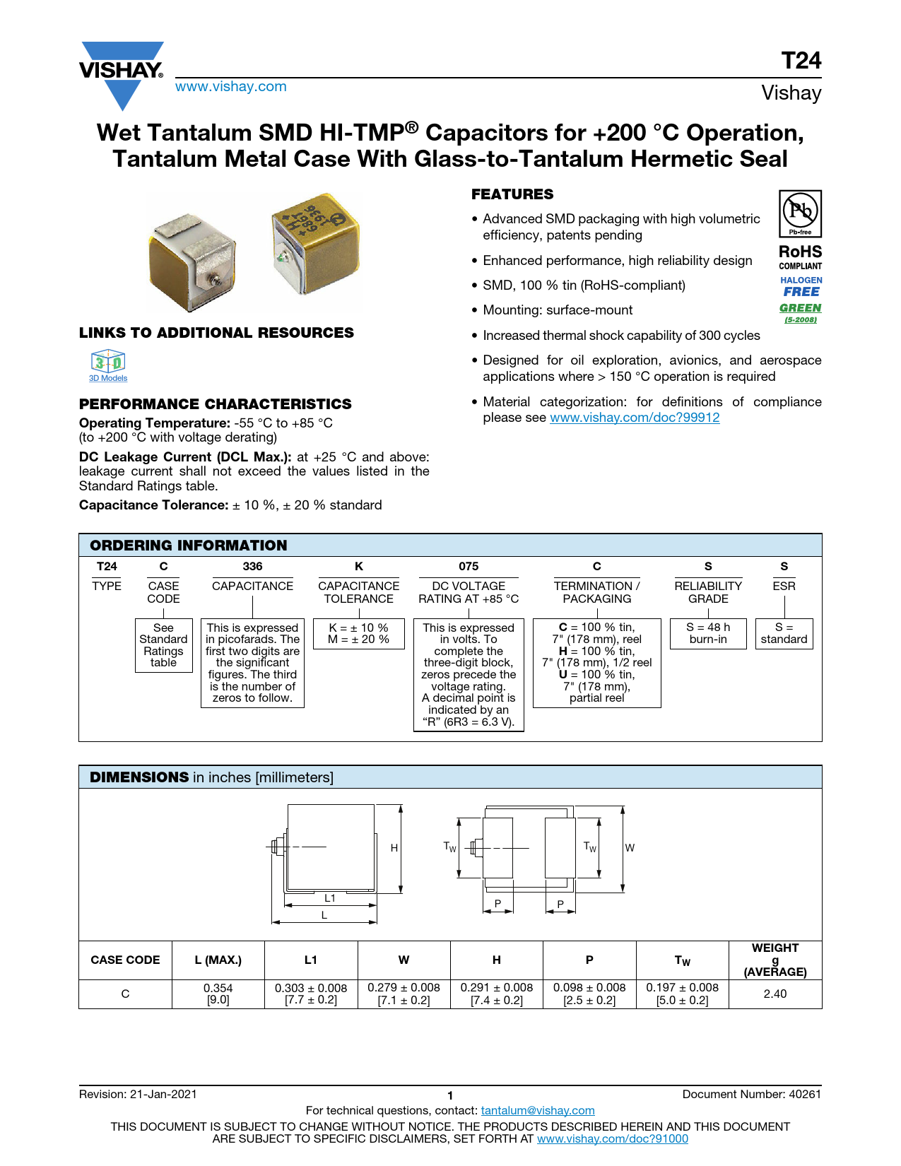 T24. Wet Tantalum SMD HI-TMP® Capacitors for +200 °C Operation,. Tantalum Metal Case With Glass-to-Tantalum Hermetic Seal