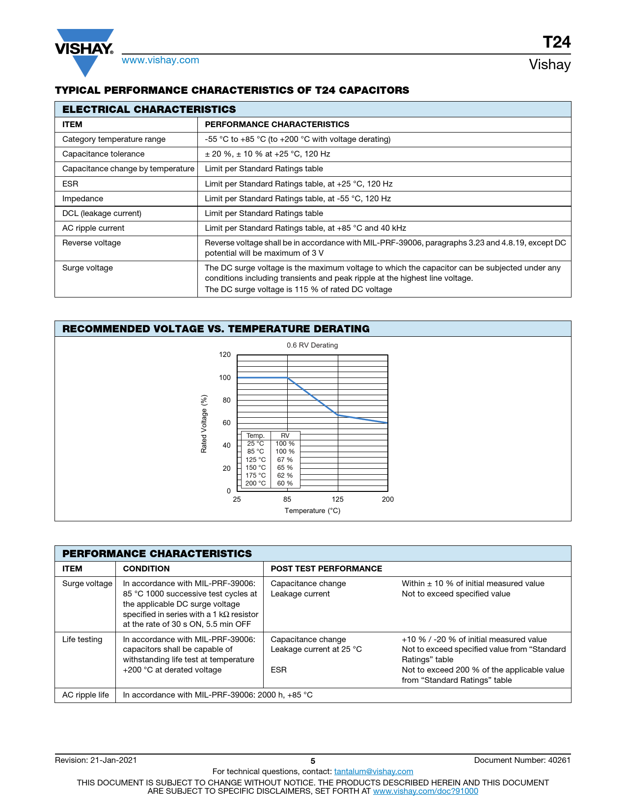 Category temperature range -55 °C to +85 °C (to +200 °C with voltage derating) Capacitance tolerance ± 20 %, ± 10 % at +25 °C, 120 Hz Capacitance change by temperature Limit per Standard Ratings table ESR Limit per Standard Ratings table, at +25 °C, 120 Hz Impedance Limit per Standard Ratings table, at -55 °C, 120 Hz DCL (leakage current) Limit per Standard Ratings table AC ripple current Limit per Standard Ratings table, at +85 °C and 40 kHz Reverse voltage Reverse voltage shall be in accordance with MIL-PRF-39006, paragraphs 3.23 and 4.8.19, except DC potential will be maximum of 3 V Surge voltage The DC surge voltage is the maximum voltage to which the capacitor can be subjected under any conditions including transients and peak ripple at the highest line voltage. The DC surge voltage is 115 % of rated DC voltage