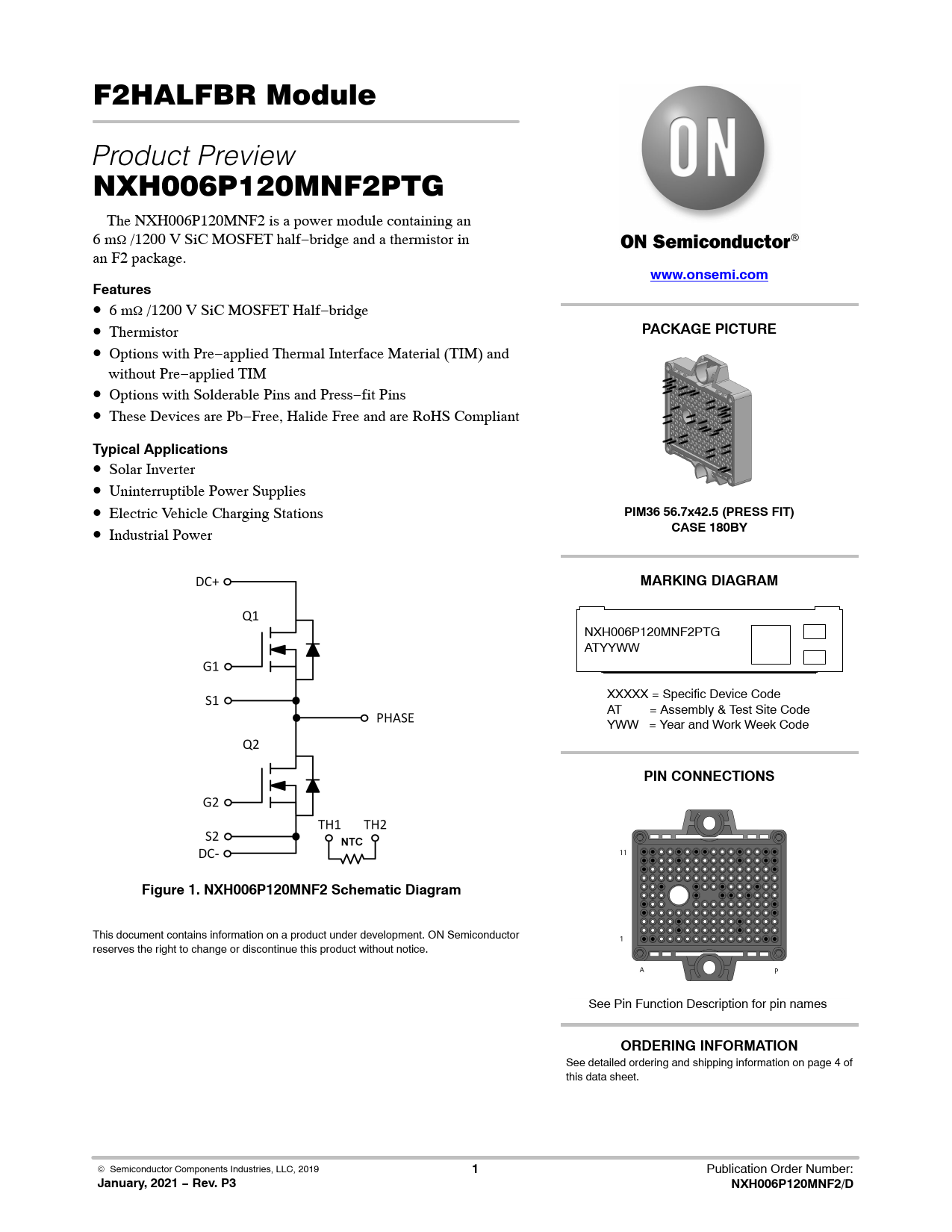 link to page 4 F2HALFBR Module Product Preview NXH006P120MNF2PTG The NXH006P120MNF2 is a power module containing an 6 mW /1200 V SiC MOSFET half−bridge and a thermistor in an F2 package.