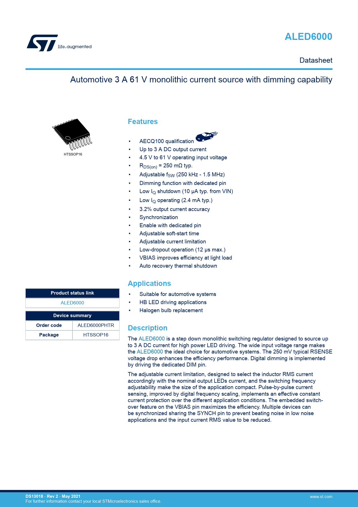 ALED6000. Features. Applications. Product status link. Device summary. Order code. Description. Package. DS13018. Rev 2. May 2021
