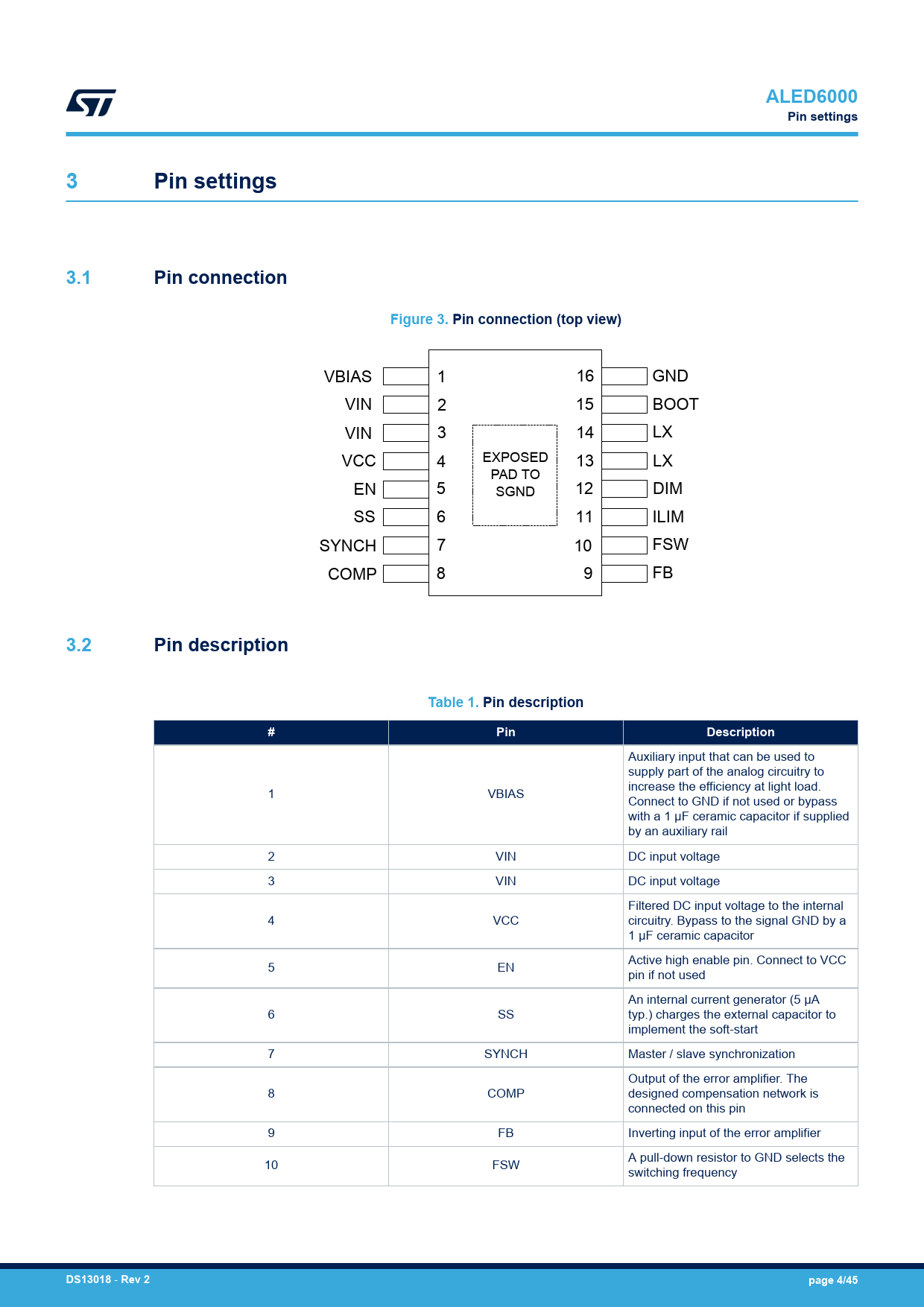 ALED6000. Pin settings. 3.1. Pin connection. Figure 3. Pin connection (top view). 3.2. Pin description. Table 1. Pin description. Pin
