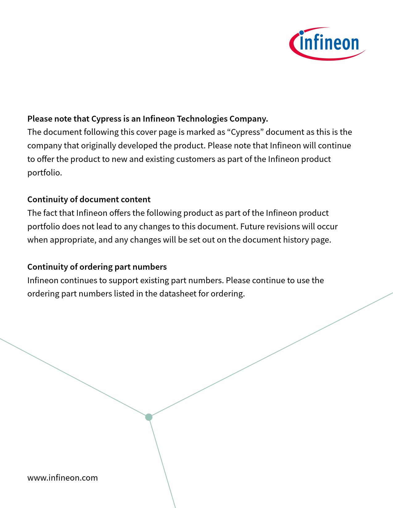 Please note that Cypress is an Infineon Technologies Company. The document following this cover page is marked as “Cypress” document as this is the company that originally developed the product. Please note that Infineon will continue to offer the product to new and existing customers as part of the Infineon product portfolio. Continuity of document content The fact that Infineon offers the following product as part of the Infineon product portfolio does not lead to any changes to this document. Future revisions will occur when appropriate, and any changes will be set out on the document history page. Continuity of ordering part numbers Infineon continues to support existing part numbers. Please continue to use the ordering part numbers listed in the datasheet for ordering. www.infineon.com Document Outline 1. CYW43455 Overview 1.1 Overview 1.2 Standards Compliance 2. Power Supplies and Power Management 2.1 Power Supply Topology 2.2 CYW43455 PMU Features 2.3 WLAN Power Management 2.4 PMU Sequencing Each resource is in one of four states: 2.5 Power-Off Shutdown 2.6 Power-Up/Power-Down/Reset Circuits 3. Frequency References 3.1 Crystal Interface and Clock Generation 3.2 External Frequency Reference 3.3 Frequency Selection 3.4 External 32.768 kHz Low-Power Oscillator 4. Bluetooth Subsystem Overview 4.1 Features 4.2 Bluetooth Radio 4.2.1 Transmit 4.2.2 Digital Modulator 4.2.3 Digital Demodulator and Bit Synchronizer 4.2.4 Power Amplifier 4.2.5 Receiver 4.2.6 Digital Demodulator and Bit Synchronizer 4.2.7 Receiver Signal Strength Indicator 4.2.8 Local Oscillator Generation 4.2.9 Calibration 5. Bluetooth Baseband Core 5.1 Bluetooth 4.0 Features 5.2 Bluetooth 4.2 Features 5.3 Bluetooth Low Energy 5.4 Bluetooth 5.0 5.5 Link Control Layer 5.6 Test Mode Support 5.7 Bluetooth Power Management Unit 5.7.1 RF Power Management 5.7.2 Host Controller Power Management 5.7.3 BBC Power Management 5.8 Adaptive Frequency Hopping 5.9 Advanced Bluetooth/WLAN Coexistence 5.10 Fast Connection (Interlaced Page and Inquiry Scans) 6. Microprocessor and Memory Unit for Bluetooth 6.1 RAM, ROM, and Patch Memory 6.2 Reset 7. Bluetooth Peripheral Transport Unit 7.1 SPI Interface 7.2 SPI/UART Transport Detection 7.3 PCM Interface 7.3.1 Slot Mapping 7.3.2 Frame Synchronization 7.3.3 Data Formatting 7.3.4 Wideband Speech Support 7.3.5 Multiplexed Bluetooth Over PCM 7.3.6 Burst PCM Mode 7.3.7 PCM Interface Timing 7.4 UART Interface 7.5 I2S Interface 7.5.1 I2S Timing 8. WLAN Global Functions 8.1 WLAN CPU and Memory Subsystem 8.2 One-Time Programmable Memory 8.3 GPIO Interface 8.4 External Coexistence Interface 8.5 UART Interface 8.6 JTAG/SWD Interface 9. WLAN Host Interfaces 9.1 SDIO v3.0 9.2 SDIO Pins 9.3 PCI Express Interface 9.4 Transaction Layer Interface 9.4.1 Data Link Layer 9.4.2 Physical Layer 9.4.3 Logical Subblock 9.4.4 Scrambler/Descrambler 9.4.5 8B/10B Encoder/Decoder 9.4.6 Elastic FIFO 9.4.7 Electrical Subblock 9.4.8 Configuration Space 10. Wireless LAN MAC and PHY 10.1 IEEE 802.11ac MAC 10.1.1 PSM 10.1.2 WEP 10.1.3 TXE 10.1.4 RXE 10.1.5 IFS 10.1.6 TSF 10.1.7 NAV 10.1.8 MAC-PHY Interface 10.2 IEEE 802.11ac PHY 11. WLAN Radio Subsystem 11.1 Receiver Path 11.2 Transmit Path 11.3 Calibration 12. Ball Map and Pin Descriptions 12.1 Ball Map 12.2 Pin List by Pin Number 12.3 Pin List by Pin Name 12.4 Pin Descriptions 12.5 WLAN GPIO Signals and Strapping Options 12.5.1 Multiplexed Bluetooth GPIO Signals 12.6 I/O States 13. DC Characteristics 13.1 Absolute Maximum Ratings 13.2 Environmental Ratings 13.3 Electrostatic Discharge Specifications 13.4 Recommended Operating Conditions and DC Characteristics 14. Bluetooth RF Specifications 15. WLAN RF Specifications 15.1 Introduction 15.2 2.4 GHz Band General RF Specifications 15.3 WLAN 2.4 GHz Receiver Performance Specifications 15.4 WLAN 2.4 GHz Transmitter Performance Specifications 15.5 WLAN 5 GHz Receiver Performance Specifications 15.6 WLAN 5 GHz Transmitter Performance Specifications 15.7 General Spurious Emissions Specifications 15.7.1 Transmitter Spurious Emissions Specifications 15.7.2 Receiver Spurious Emissions Specifications 16. Internal Regulator Electrical Specifications 16.1 Core Buck Switching Regulator 16.2 3.3V LDO (LDO3P3) 16.3 2.5V LDO (BTLDO2P5) 16.4 CLDO 16.5 LNLDO 16.6 PCIe LDO 17. System Power Consumption 17.1 WLAN Current Consumption 17.1.1 2.4 GHz Mode 17.1.2 5 GHz Mode 17.2 Bluetooth Current Consumption 18. Interface Timing and AC Characteristics 18.1 SDIO Timing 18.1.1 SDIO Default Mode Timing 18.2 SDIO High-Speed Mode Timing 18.2.1 SDIO Bus Timing Specifications in SDR Modes 18.2.2 SDIO Bus Timing Specifications in DDR50 Mode 18.3 PCI Express Interface Parameters 18.4 JTAG Timing 18.5 SWD Timing 19. Power-Up Sequence and Timing 19.1 Sequencing of Reset and Regulator Control Signals 19.1.1 Description of Control Signals 19.1.2 Control Signal Timing Diagrams 20. Package Information 20.1 Package Thermal Characteristics 20.2 Junction Temperature Estimation and PSIJT Versus THETAJC 20.3 Environmental Characteristics 21. Mechanical Information 22. Ordering Information 23. Additional Information 23.1 Acronyms and Abbreviations 23.2 References 23.3 IoT Resources Document History Page Sales, Solutions, and Legal Information Worldwide Sales and Design Support Products PSoC® Solutions Cypress Developer Community Technical Support