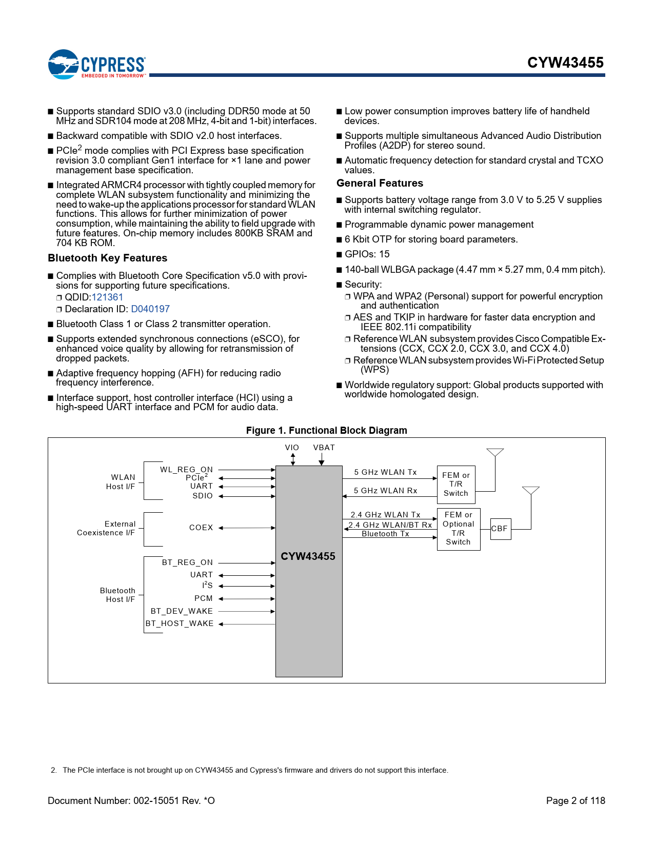 Seiten / Seite121 / 3 — CYW43455. General Features. Bluetooth Key Features. Figure 1. Functional …