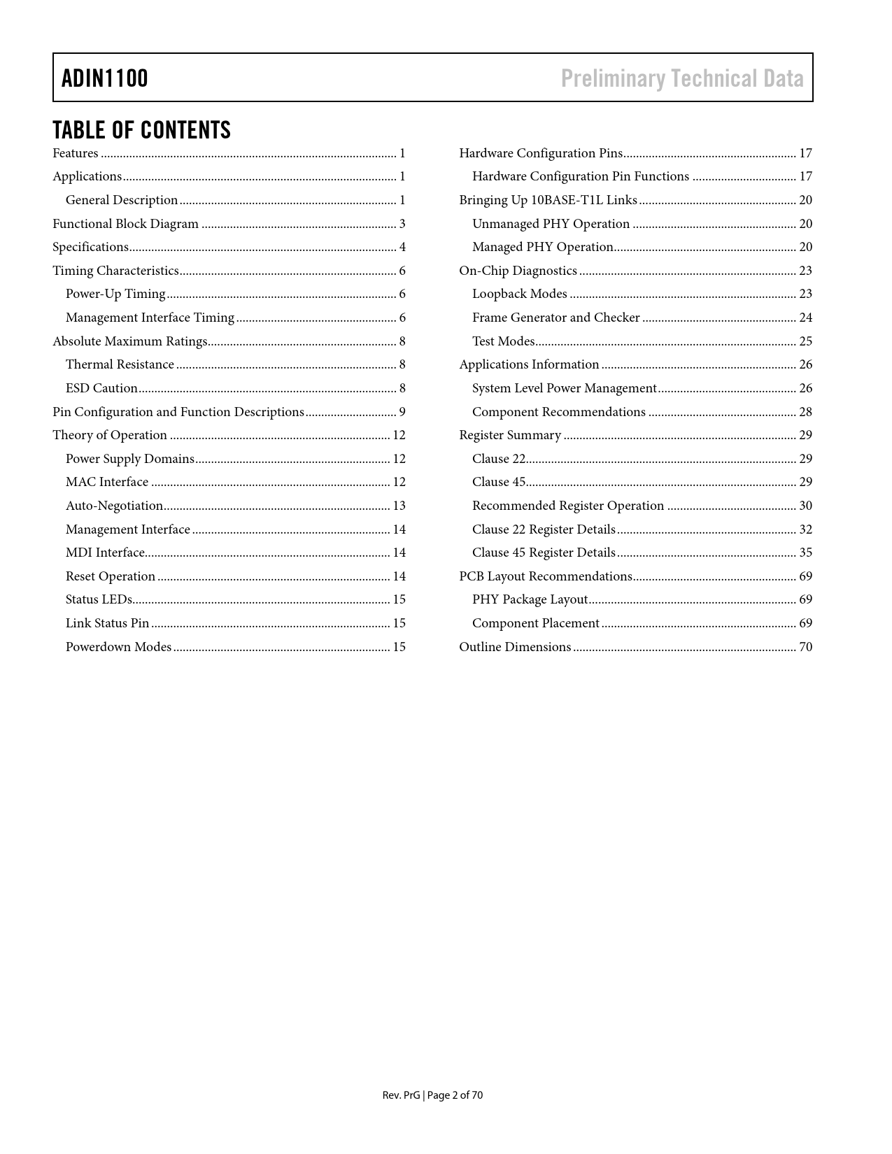 link to page 1 link to page 1 link to page 1 link to page 3 link to page 4 link to page 6 link to page 6 link to page 6 link to page 8 link to page 8 link to page 8 link to page 9 link to page 12 link to page 12 link to page 12 link to page 13 link to page 14 link to page 14 link to page 14 link to page 15 link to page 15 link to page 15 link to page 17 link to page 17 link to page 20 link to page 20 link to page 20 link to page 23 link to page 23 link to page 24 link to page 25 link to page 26 link to page 26 link to page 28 link to page 29 link to page 29 link to page 29 link to page 30 link to page 32 link to page 35 link to page 69 link to page 69 link to page 69 link to page 70 ADIN1100Preliminary Technical DataTABLE OF CONTENTS Features .. 1 Hardware Configuration Pins ... 17 Applications ... 1 Hardware Configuration Pin Functions ... 17 General Description ... 1 Bringing Up 10BASE-T1L Links .. 20 Functional Block Diagram .. 3 Unmanaged PHY Operation .. 20 Specifications ... 4 Managed PHY Operation.. 20 Timing Characteristics ... 6 On-Chip Diagnostics ... 23 Power-Up Timing ... 6 Loopback Modes .. 23 Management Interface Timing ... 6 Frame Generator and Checker ... 24 Absolute Maximum Ratings .. 8 Test Modes ... 25 Thermal Resistance .. 8 Applications Information .. 26 ESD Caution .. 8 System Level Power Management .. 26 Pin Configuration and Function Descriptions ... 9 Component Recommendations ... 28 Theory of Operation .. 12 Register Summary .. 29 Power Supply Domains .. 12 Clause 22.. 29 MAC Interface .. 12 Clause 45.. 29 Auto-Negotiation .. 13 Recommended Register Operation ... 30 Management Interface ... 14 Clause 22 Register Details ... 32 MDI Interface.. 14 Clause 45 Register Details ... 35 Reset Operation .. 14 PCB Layout Recommendations .. 69 Status LEDs.. 15 PHY Package Layout .. 69 Link Status Pin .. 15 Component Placement .. 69 Powerdown Modes ... 15 Outline Dimensions ... 70 Rev. PrG | Page 2 of 70 Document Outline Features Applications General Description Functional Block Diagram Specifications Timing Characteristics Power-Up Timing Management Interface Timing Absolute Maximum Ratings Thermal Resistance ESD Caution Pin Configuration and Function Descriptions Theory of Operation Power Supply Domains MAC Interface MII Interface Mode RMII Interface Mode RGMII Interface Mode Auto-Negotiation Transmit Amplitude Resolution Master/Slave Resolution Management Interface Interrupt (INT_N) MDI Interface Reset Operation Power-On Reset Hardware Reset Software Reset PHY Subsystem Reset MAC Interface Reset Status LEDs LED Function Link Status Pin Powerdown Modes Hardware Powerdown Mode Software Powerdown Mode Hardware Configuration Pins Hardware Configuration Pin Functions PHY Address Configuration Software Powerdown after Reset Master/Slave Preference Transmit Amplitude MAC Interface Selection Media Convertor Bringing Up 10BASE-T1L Links Unmanaged PHY Operation Managed PHY Operation Power-up and Reset Complete Configuring the Part for Linking Advertisement of Transmit Level Operating Mode Advertisement of Master/Slave Successful Completion of Auto-Negotiation Link Status On-Chip Diagnostics Loopback Modes PMA Loopback PCS Loopback MAC Interface Loopback MAC Interface Remote Loopback External MII/RMII Loopback Frame Generator and Checker Frame Generator and Checker used with Remote Loopback with Two PHYs Test Modes Accessing the test modes Applications Information System Level Power Management Transmit Level = 1.0 V pk-pk Transmit Level = 2.4 V pk-pk Component Recommendations Crystal External Clock Input Register Summary Clause 22 Clause 45 Recommended Register Operation Latch Low Registers IEEE Duplicated Registers Read Modify Write Operation Clause 22 Register Details MII Control Register MII Status Register PHY Identifier 1 Register PHY Identifier 2 Register MMD Access Control Register MMD Access Register Clause 45 Register Details PMA/PMD Control 1 Register PMA/PMD Status 1 Register PMA/PMD MMD Devices in Package 1 Register PMA/PMD MMD Devices in Package 2 Register PMA/PMD Control 2 Register PMA/PMD Status 2 Register PMA/PMD Transmit Disable Register PMA/PMD Extended Abilities Register BASE-T1 PMA/PMD Extended Ability Register BASE-T1 PMA/PMD Control Register 10BASE-T1L PMA Control Register 10BASE-T1L PMA Status Register 10BASE-T1L Test Mode Control Register Frequency Offset Saturation Threshold for CR Stability Check Register Slave IIR Filter Change Echo Acquisition Clock Recovery Proportional Gain Register 10BASE-T1L PMA Link Status Register MSE Value Register PCS Control 1 Register PCS Status 1 Register PCS MMD Devices in Package 1 Register PCS MMD Devices in Package 2 Register PCS Status 2 Register 10BASE-T1L PCS Control Register 10BASE-T1L PCS Status Register AUTO-_NEGOTIATION MMD Devices in Package 1 Register AUTO-_NEGOTIATION MMD Devices in Package 2 Register BASE-T1 Autonegotiation Control Register BASE-T1 Autonegotiation Status Register BASE-T1 Autonegotiation Advertisement [15:0] Register BASE-T1 Autonegotiation Advertisement [31:16] Register BASE-T1 Autonegotiation Advertisement [47:32] Register BASE-T1 Autonegotiation Link Partner Base Page Ability [15:0] Register BASE-T1 Autonegotiation Link Partner Base Page Ability [31:16] Register BASE-T1 Autonegotiation Link Partner Base Page Ability [47:32] Register BASE-T1 Autonegotiation Next Page Transmit [15:0] Register BASE-T1 Autonegotiation Next Page Transmit [31:16] Register BASE-T1 Autonegotiation Next Page Transmit [47:32] Register BASE-T1 Autonegotiation Link Partner Next Page Ability [15:0] Register BASE-T1 Autonegotiation Link Partner Next Page Ability [31:16] Register BASE-T1 Autonegotiation Link Partner Next Page Ability [47:32] Register 10BASE-T1 Autonegotiation Control Register 10BASE-T1 Autonegotiation Status Register Extra Autonegotiation Status Register PHY Instantaneous Status Register Vendor Specific MMD 1 Device Identifier High Register Vendor Specific MMD 1 Device Identifier Low Register Vendor Specific