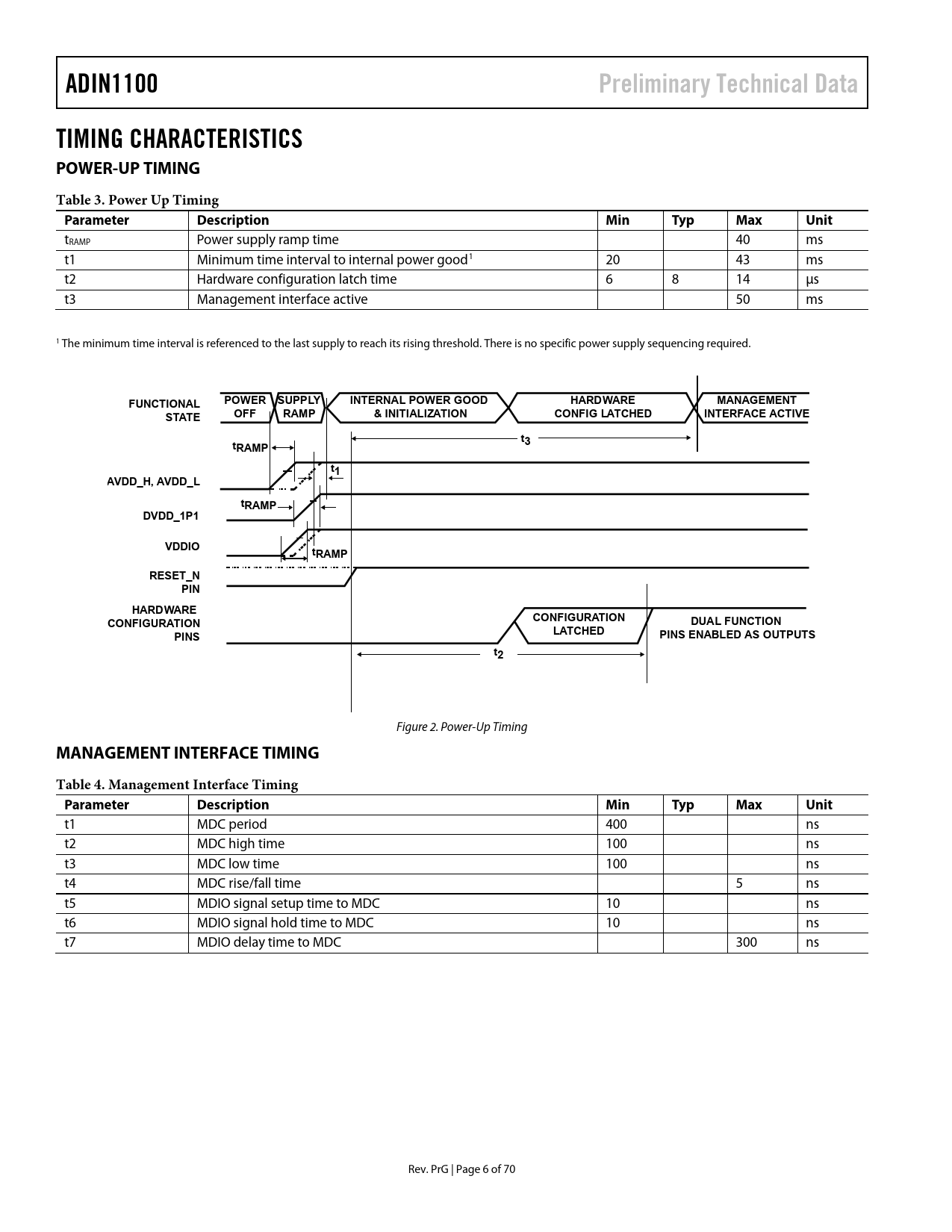ADIN1100. Preliminary Technical Data. TIMING CHARACTERISTICS POWER-UP TIMING. Table 3. Power Up Timing. Parameter. Description. Min