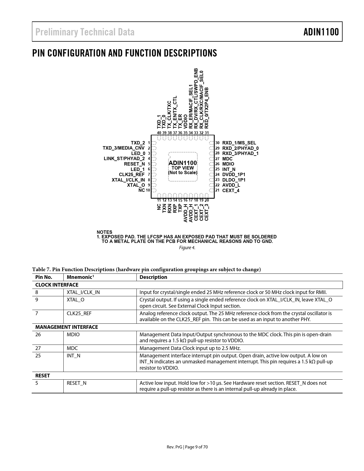 Seiten / Seite70 / 9 — Preliminary Technical Data. ADIN1100. PIN CONFIGURATION AND FUNCTION …