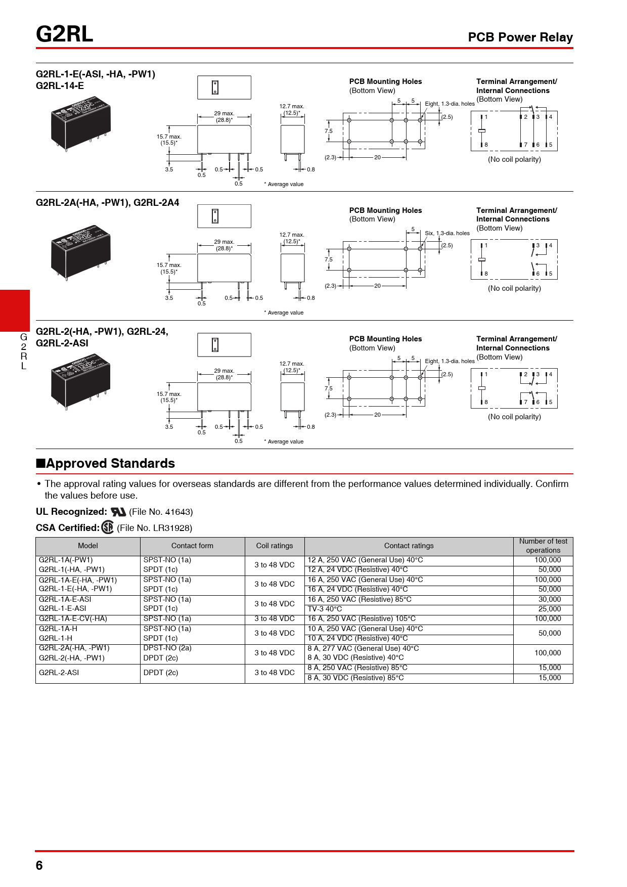 (File No. LR31928) Number of test Model Contact form Coil ratings Contact ratings operations G2RL-1A(-PW1) SPST-NO (1a) 12 A, 250 VAC (General Use) 40°C 100,000 3 to 48 VDC G2RL-1(-HA, -PW1) SPDT (1c) 12 A, 24 VDC (Resistive) 40°C 50,000 G2RL-1A-E(-HA, -PW1) SPST-NO (1a) 16 A, 250 VAC (General Use) 40°C 100,000 3 to 48 VDC G2RL-1-E(-HA, -PW1) SPDT (1c) 16 A, 24 VDC (Resistive) 40°C 50,000 G2RL-1A-E-ASI SPST-NO (1a) 16 A, 250 VAC (Resistive) 85°C 30,000 3 to 48 VDC G2RL-1-E-ASI SPDT (1c) TV-3 40°C 25,000 G2RL-1A-E-CV(-HA) SPST-NO (1a) 3 to 48 VDC 16 A, 250 VAC (Resistive) 105°C 100,000 G2RL-1A-H SPST-NO (1a) 10 A, 250 VAC (General Use) 40°C 3 to 48 VDC 50,000 G2RL-1-H SPDT (1c) 10 A, 24 VDC (Resistive) 40°C G2RL-2A(-HA, -PW1) DPST-NO (2a) 8 A, 277 VAC (General Use) 40°C 3 to 48 VDC 100,000 G2RL-2(-HA, -PW1) DPDT (2c) 8 A, 30 VDC (Resistive) 40°C 8 A, 250 VAC (Resistive) 85°C 15,000 G2RL-2-ASI DPDT (2c) 3 to 48 VDC 8 A, 30 VDC (Resistive) 85°C 15,000