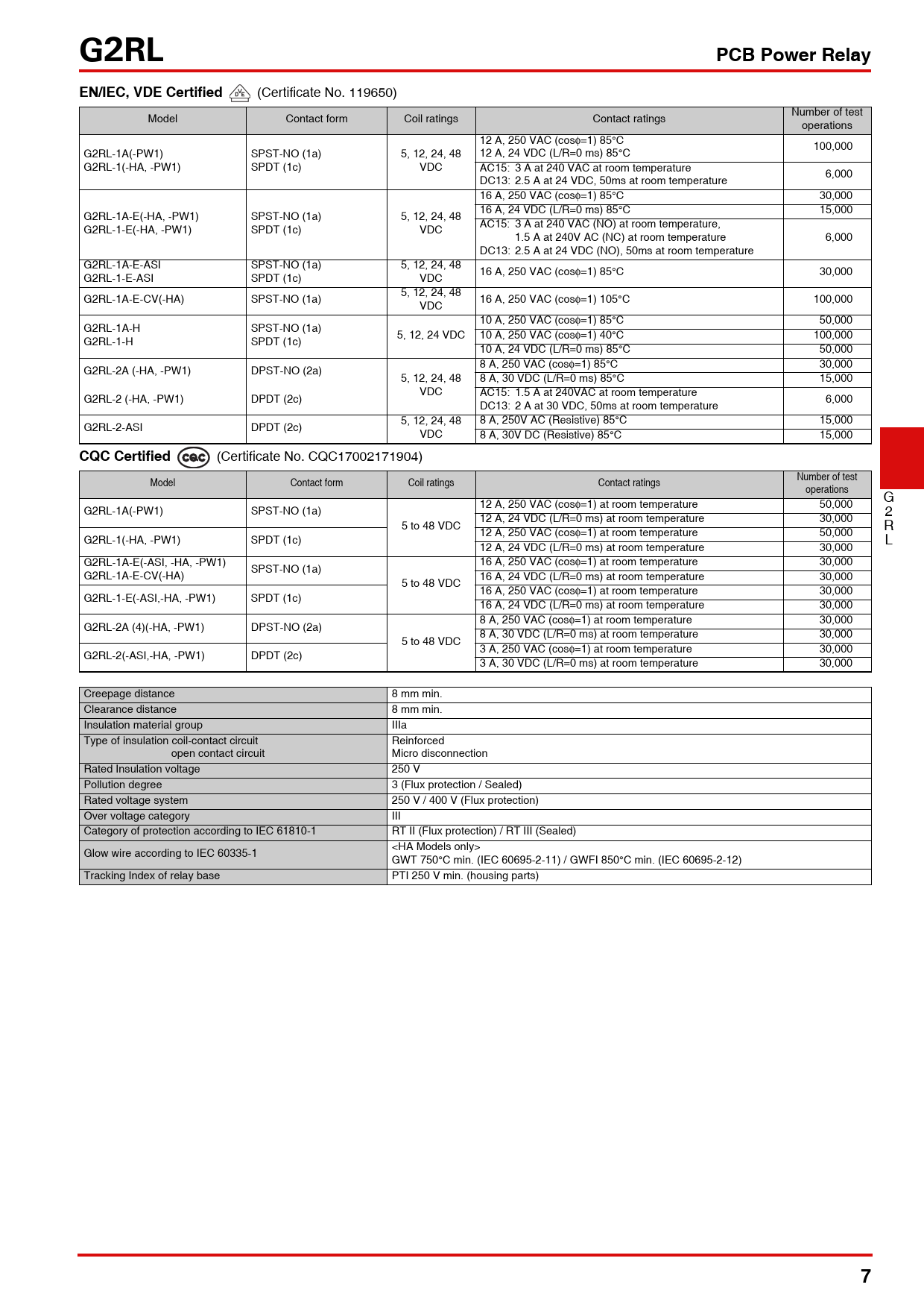 G2RL PCB Power RelayEN/IEC, VDE Certified (Certificate No. 119650) Number of test Model Contact form Coil ratings Contact ratings operations 12 A, 250 VAC (cosφ=1) 85°C 100,000 G2RL-1A(-PW1) SPST-NO (1a) 5, 12, 24, 48 12 A, 24 VDC (L/R=0 ms) 85°C G2RL-1(-HA, -PW1) SPDT (1c) VDC AC15: 3 A at 240 VAC at room temperature 6,000 DC13: 2.5 A at 24 VDC, 50ms at room temperature 16 A, 250 VAC (cosφ=1) 85°C 30,000 16 A, 24 VDC (L/R=0 ms) 85°C 15,000 G2RL-1A-E(-HA, -PW1) SPST-NO (1a) 5, 12, 24, 48 G2RL-1-E(-HA, -PW1) SPDT (1c) VDC AC15: 3 A at 240 VAC (NO) at room temperature, 1.5 A at 240V AC (NC) at room temperature 6,000 DC13: 2.5 A at 24 VDC (NO), 50ms at room temperature G2RL-1A-E-ASI SPST-NO (1a) 5, 12, 24, 48 16 A, 250 VAC (cos G2RL-1-E-ASI SPDT (1c) VDC φ=1) 85°C 30,000 5, 12, 24, 48 G2RL-1A-E-CV(-HA) SPST-NO (1a) 16 A, 250 VAC (cos VDC φ=1) 105°C 100,000 10 A, 250 VAC (cosφ=1) 85°C 50,000 G2RL-1A-H SPST-NO (1a) 5, 12, 24 VDC 10 A, 250 VAC (cos G2RL-1-H SPDT (1c) φ=1) 40°C 100,000 10 A, 24 VDC (L/R=0 ms) 85°C 50,000 8 A, 250 VAC (cosφ=1) 85°C 30,000 G2RL-2A (-HA, -PW1) DPST-NO (2a) 5, 12, 24, 48 8 A, 30 VDC (L/R=0 ms) 85°C 15,000 VDC AC15: 1.5 A at 240VAC at room temperature G2RL-2 (-HA, -PW1) DPDT (2c) 6,000 DC13: 2 A at 30 VDC, 50ms at room temperature 5, 12, 24, 48 8 A, 250V AC (Resistive) 85°C 15,000 G2RL-2-ASI DPDT (2c) VDC 8 A, 30V DC (Resistive) 85°C 15,000 CQC Certified (Certificate No. CQC17002171904) Number of test Model Contact form Coil ratings Contact ratings operations G 12 A, 250 VAC (cosφ=1) at room temperature 50,000 G2RL-1A(-PW1) SPST-NO (1a) 2 12 A, 24 VDC (L/R=0 ms) at room temperature 30,000 5 to 48 VDC R 12 A, 250 VAC (cosφ=1) at room temperature 50,000 G2RL-1(-HA, -PW1) SPDT (1c) L 12 A, 24 VDC (L/R=0 ms) at room temperature 30,000 G2RL-1A-E(-ASI, -HA, -PW1) 16 A, 250 VAC (cosφ=1) at room temperature 30,000 SPST-NO (1a) G2RL-1A-E-CV(-HA) 16 A, 24 VDC (L/R=0 ms) at room temperature 30,000 5 to 48 VDC 16 A, 250 VAC (cosφ=1) at room temperature 30,000 G2RL-1-E(-ASI,-HA, -PW1) SPDT (1c) 16 A, 24 VDC (L/R=0 ms) at room temperature 30,000 8 A, 250 VAC (cosφ=1) at room temperature 30,000 G2RL-2A (4)(-HA, -PW1) DPST-NO (2a) 8 A, 30 VDC (L/R=0 ms) at room temperature 30,000 5 to 48 VDC 3 A, 250 VAC (cosφ=1) at room temperature 30,000 G2RL-2(-ASI,-HA, -PW1) DPDT (2c) 3 A, 30 VDC (L/R=0 ms) at room temperature 30,000 Creepage distance 8 mm min. Clearance distance 8 mm min. Insulation material group IIIa Type of insulation coil-contact circuit Reinforced open contact circuit Micro disconnection Rated Insulation voltage 250 V Pollution degree 3 (Flux protection / Sealed) Rated voltage system 250 V / 400 V (Flux protection) Over voltage category III Category of protection according to IEC 61810-1 RT II (Flux protection) / RT III (Sealed) <HA Models only> Glow wire according to IEC 60335-1 GWT 750°C min. (IEC 60695-2-11) / GWFI 850°C min. (IEC 60695-2-12) Tracking Index of relay base PTI 250 V min. (housing parts) 7