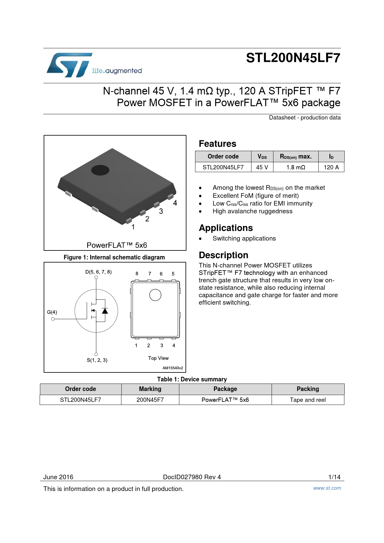 STL200N45LF7 N-channel 45 V, 1.4 mΩ typ., 120 A STripFET ™ F7 Power MOSFET in a PowerFLAT™ 5x6 package Datasheet - production data FeaturesOrder codeVDSRDS(on) max.ID STL200N45LF7 45 V 1.8 mΩ 120 A Among the lowest RDS(on) on the market Excellent FoM (figure of merit) Low Crss/Ciss ratio for EMI immunity High avalanche ruggedness Applications Switching applications Figure 1: Internal schematic diagramDescription This N-channel Power MOSFET utilizes STripFET™ F7 technology with an enhanced trench gate structure that results in very low on- state resistance, while also reducing internal capacitance and gate charge for faster and more efficient switching. Table 1: Device summaryOrder codeMarkingPackagePacking STL200N45LF7 200N45F7 PowerFLAT™ 5x6 Tape and reel June 2016 DocID027980 Rev 4 1/14 This is information on a product in full production. www.st.com